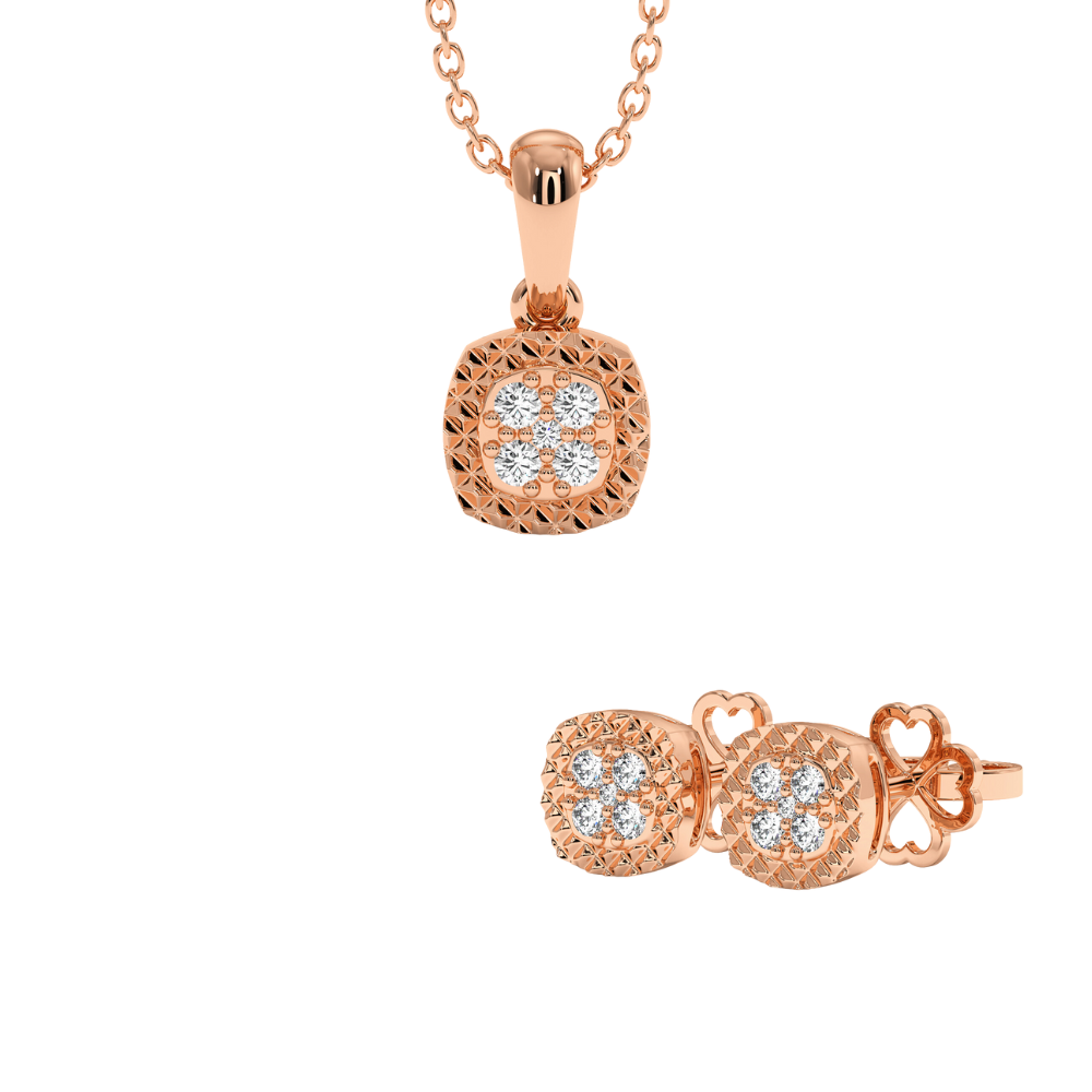 The set includes: 14K gold pendant chain with 0.07ct diamonds and 14K gold earrings with 0.09ct diamonds. The total weight of the set is approximately 5.40 grams. Go to "SPECIFICATIONS" for more details about this product.