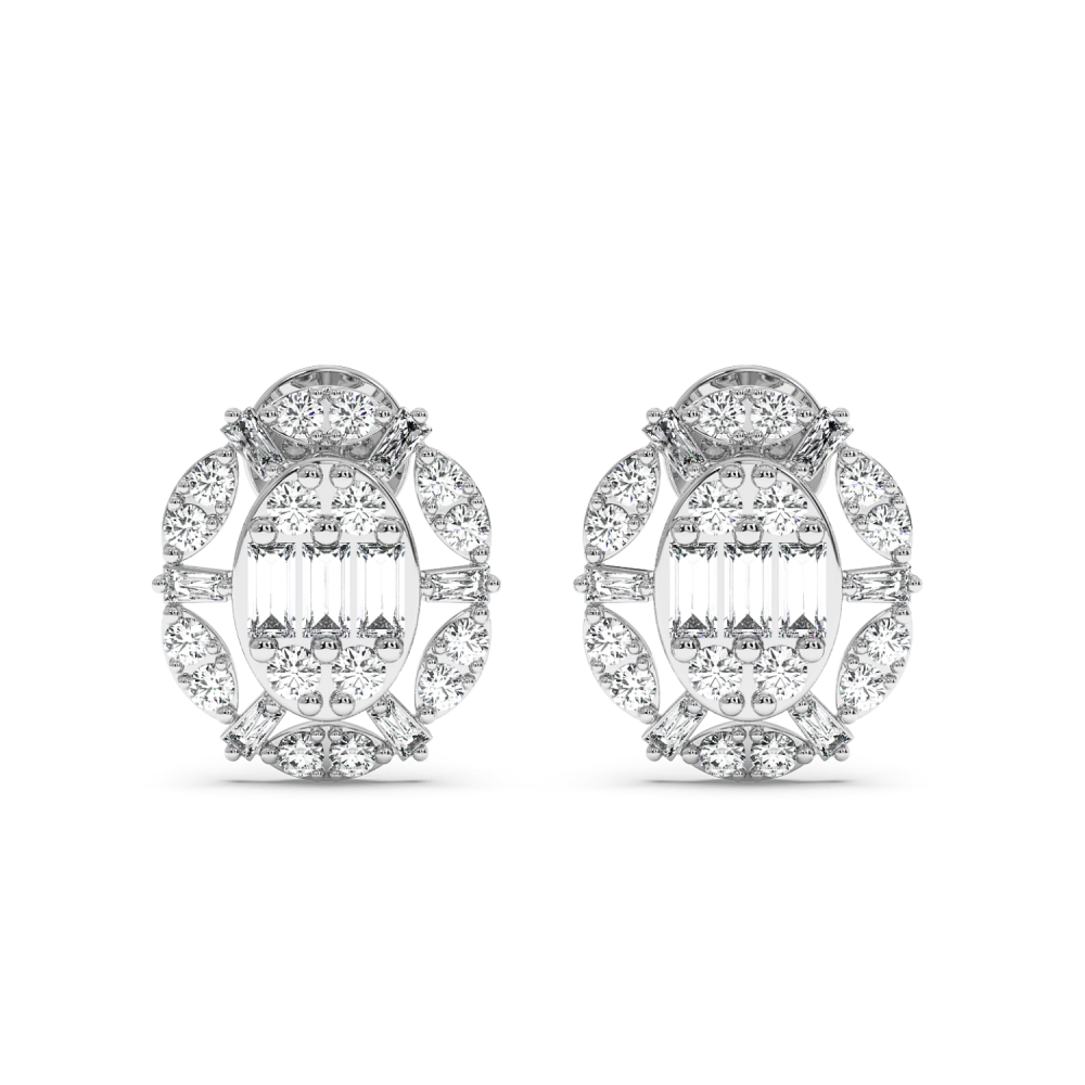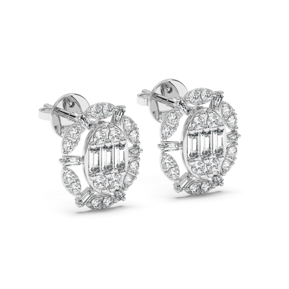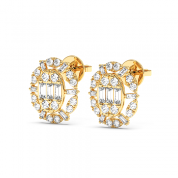 14 K gold earrings with baget diamonds of 0.26ct and round diamonds of 0.35ct. The earrings weigh approximately 3 grams.