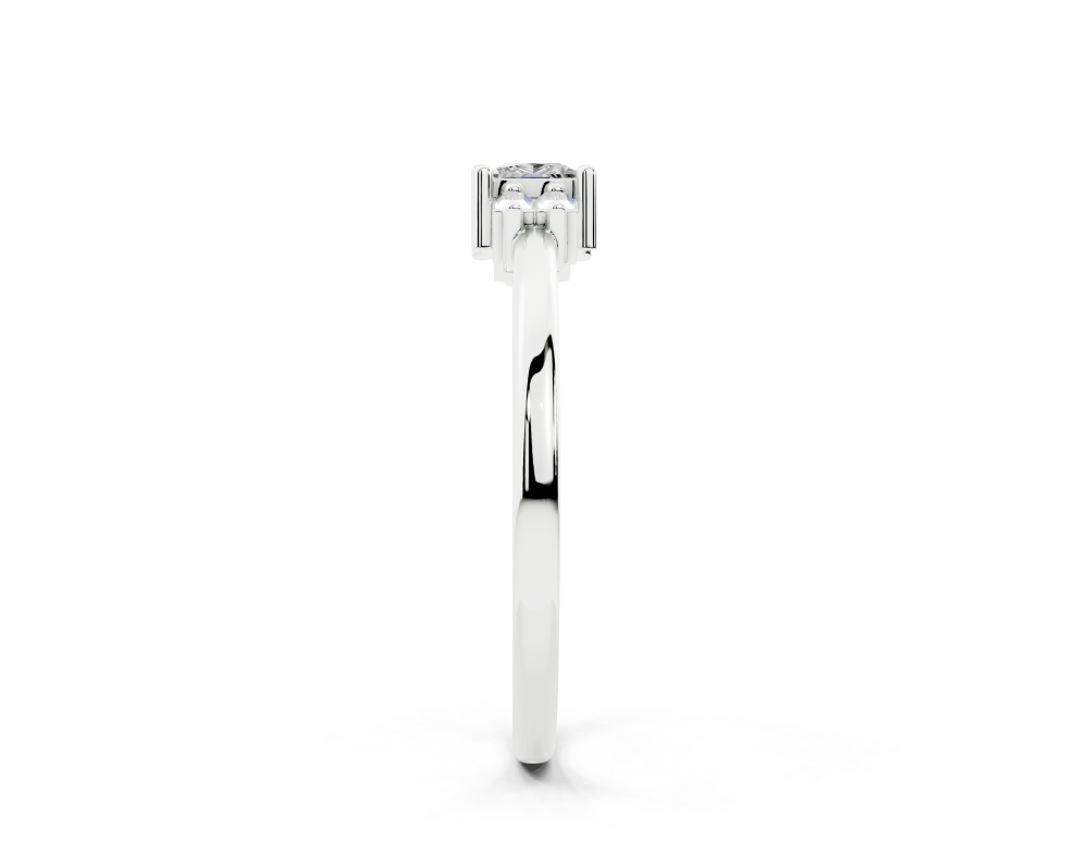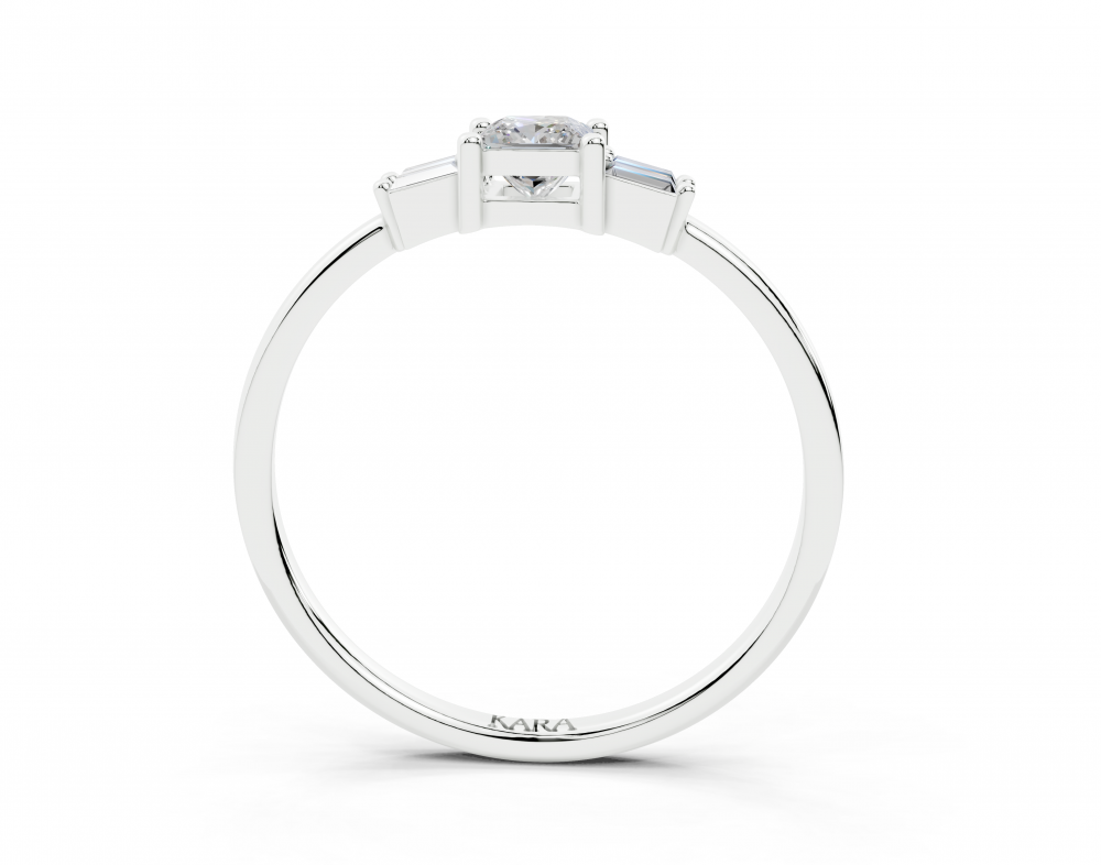 Ring in 14K white gold, with 0.27ct Princess Cut center diamond and 0.10ct Baget diamonds. Ring weight is 1.87 grams.