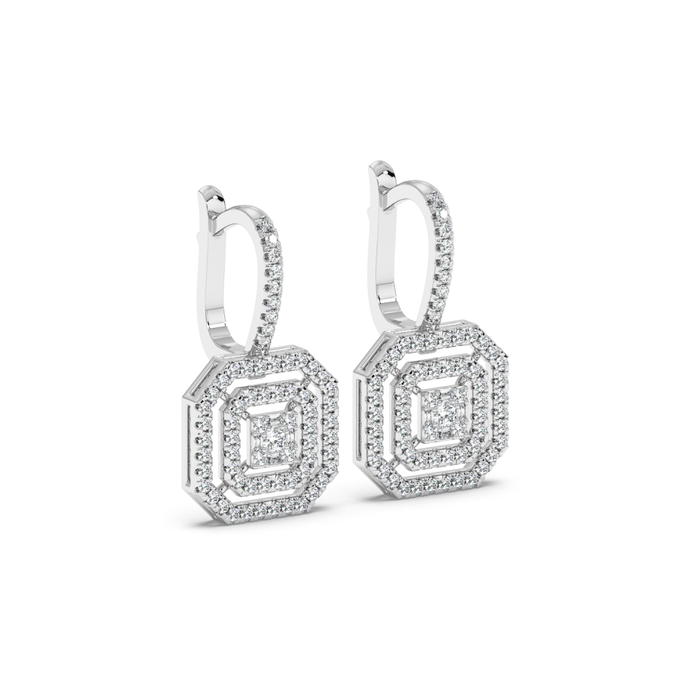 14 K white gold earrings with 0.59ct diamonds. The weight of the earrings is approximately 5.20 grams. The length of the earrings is approximately 2.30 cm.