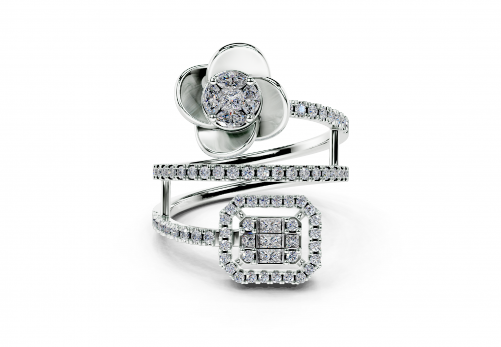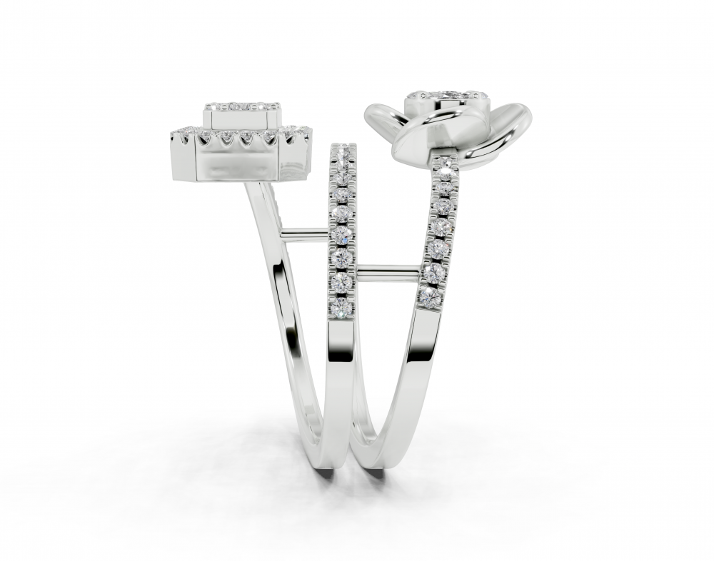 14K white gold ring with 0.10ct Marquise Cut diamonds, 0.11ct Baget diamonds, 0.05ct Princess Cut diamonds and 0.35ct round diamonds. The weight of the ring is approximately 6 grams. The ring can also be made to order in 18K gold. We can modify the design according to your budget....