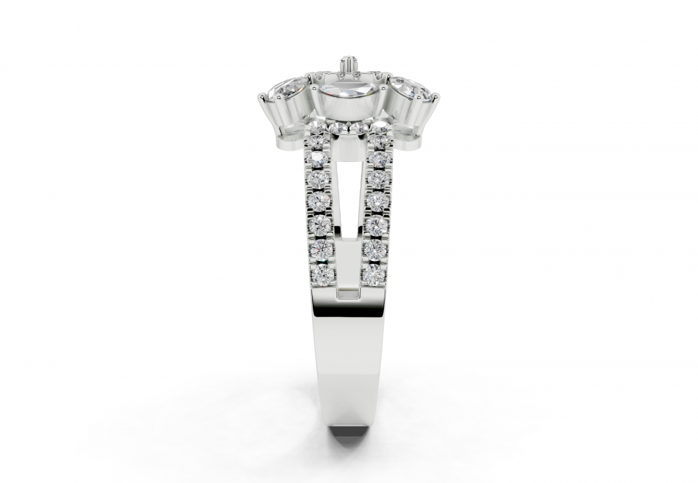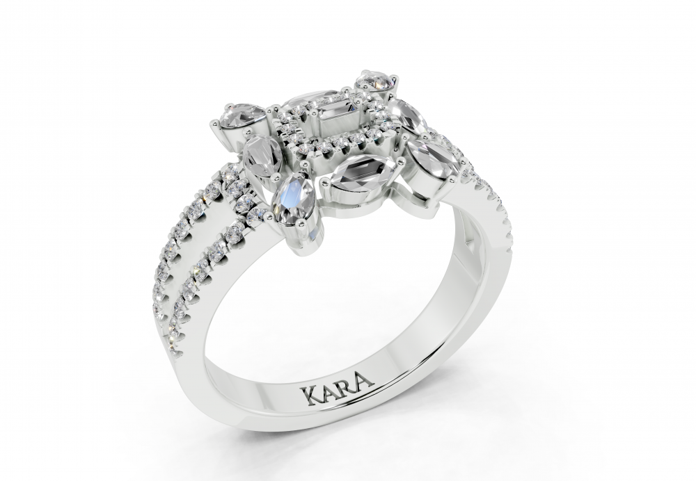 14K white gold ring, with 0.21ct Pear Cut diamonds, 0.15ct Marquise Cut diamonds, 0.01ct Baget diamonds and 0.26ct round diamonds. The weight of the ring is approximately 4 grams. Go to "Specifications" for more details about this product.