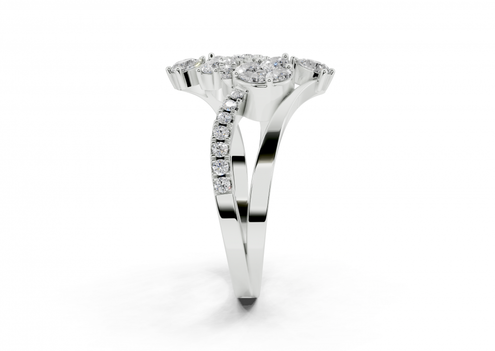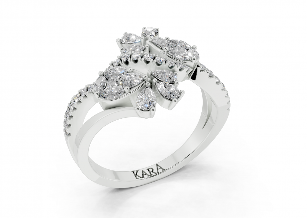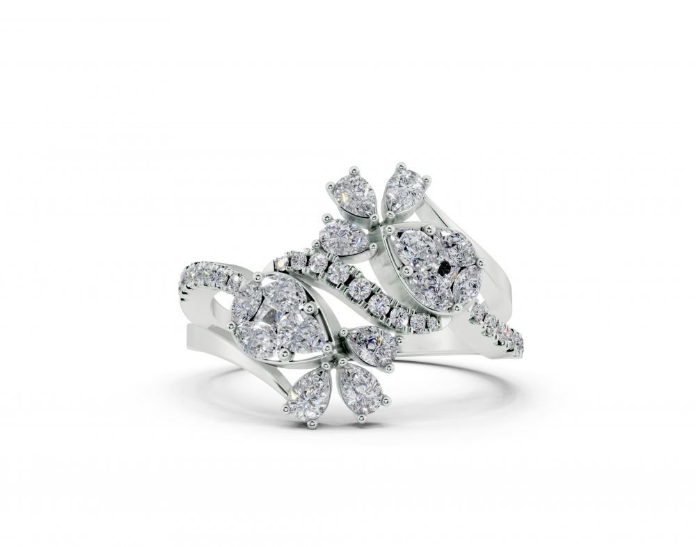 14K white gold ring with 0.42ct Pear Cut diamonds, 0.14ct Marquise Cut diamonds, 0.05ct Princess Cut diamonds and 0.13ct round diamonds. The weight of the ring is approximately 3.50 grams. The ring can also be made to order in 18K gold. We can modify the design according to your budget.