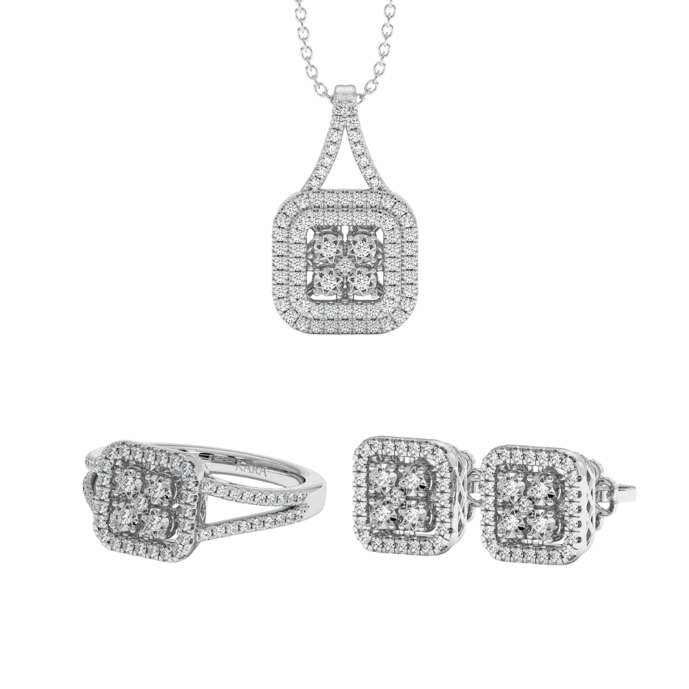 The set includes: 14K gold pendant chain with 0.31ct diamonds, 14K gold earrings with 0.28ct diamonds and 14K gold ring with 0.28ct diamonds. The total weight of the set is approximately 15.20 grams. Go to "SPECIFICATIONS" for more details about this product.