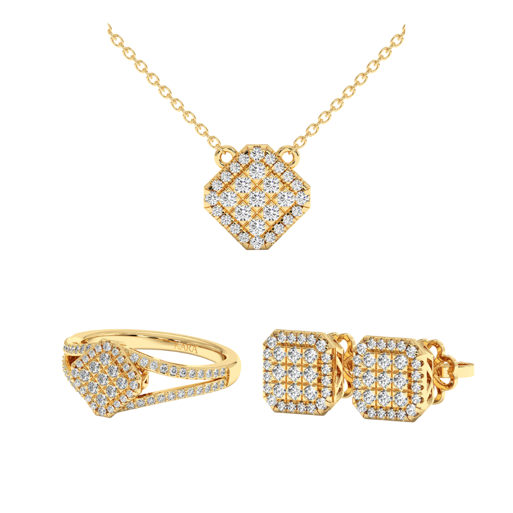The set includes: 14K gold pendant chain with 0.25ct diamonds, 14K gold earrings with 0.34ct diamonds and 14K gold ring with 0.34ct diamonds. The total weight of the set is approximately 10.50 grams. Go to "SPECIFICATIONS" for more details about this product.