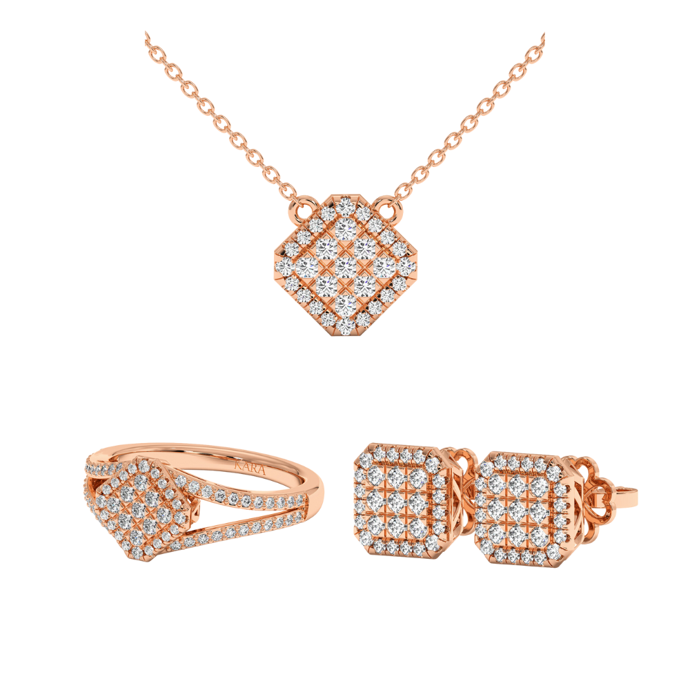 The set includes: 14K gold pendant chain with 0.25ct diamonds, 14K gold earrings with 0.34ct diamonds and 14K gold ring with 0.34ct diamonds. The total weight of the set is approximately 10.50 grams. Go to "SPECIFICATIONS" for more details about this product.