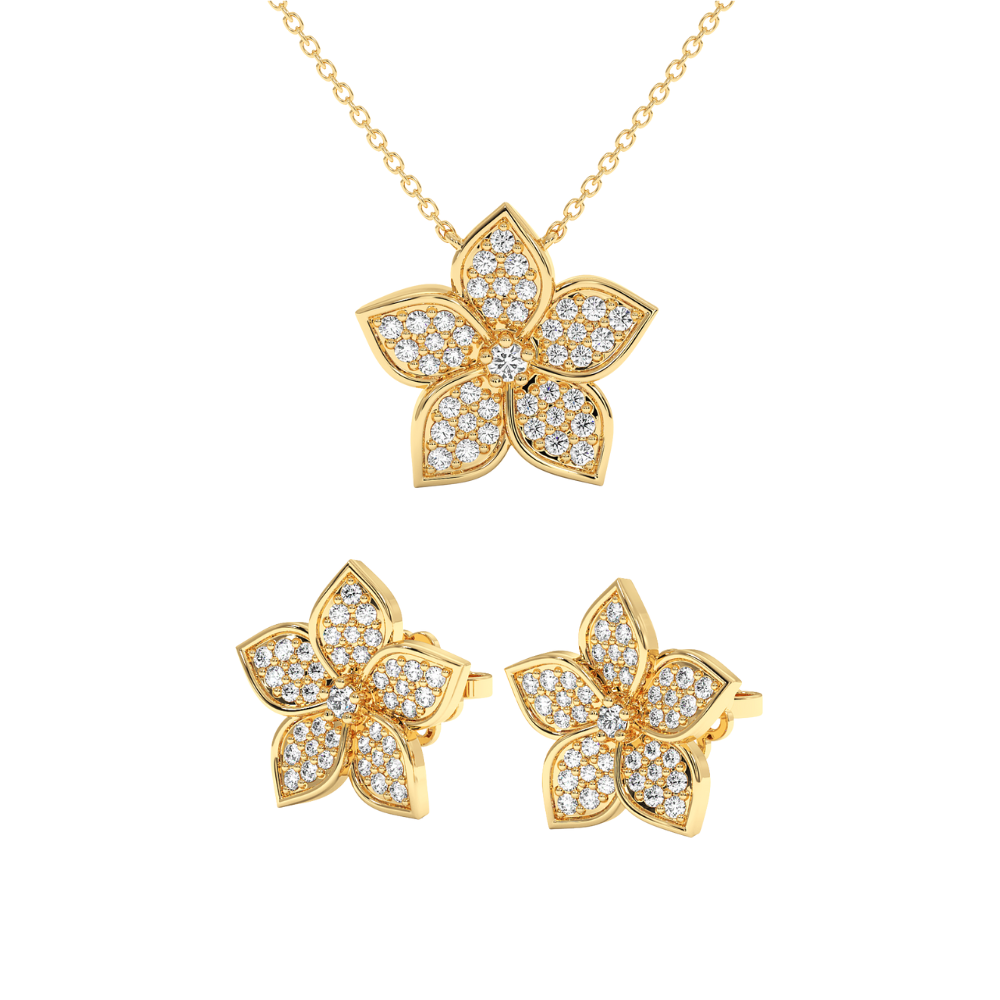 The set includes: 14K gold pendant chain with 0.50ct diamonds and 14K gold earrings with 0.52ct diamonds. The total weight of the set is approximately 7.70 grams.