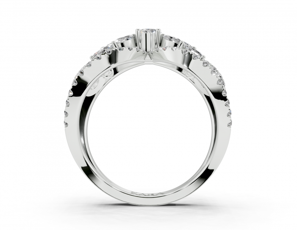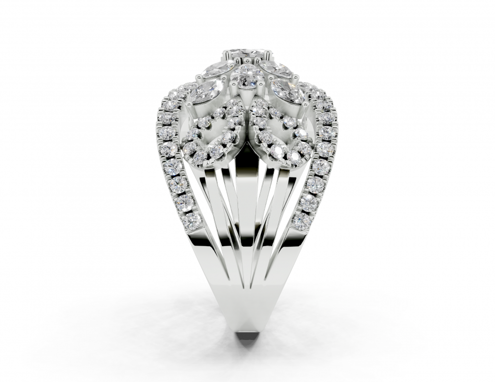 14K white gold ring with a 0.10ctm Oval center diamond, 0.30ct Marquise Cut diamonds, 0.30ct Marquise Cut diamonds, 0.17ct Pear Cut diamonds and 0.49ct round diamonds. The weight of the ring is approximately 2.00 grams. The ring can also be made to order in 18K gold. We can modify the design according to your budget.