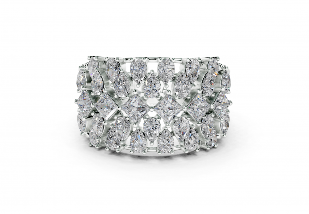 14K white gold ring with 1.35ct Pear Cut diamonds and 0.70ct Princess Cut diamonds. Ring weight is approximately 5 grams. The ring can also be made to order in 18K gold. We can modify the design according to your budget.
