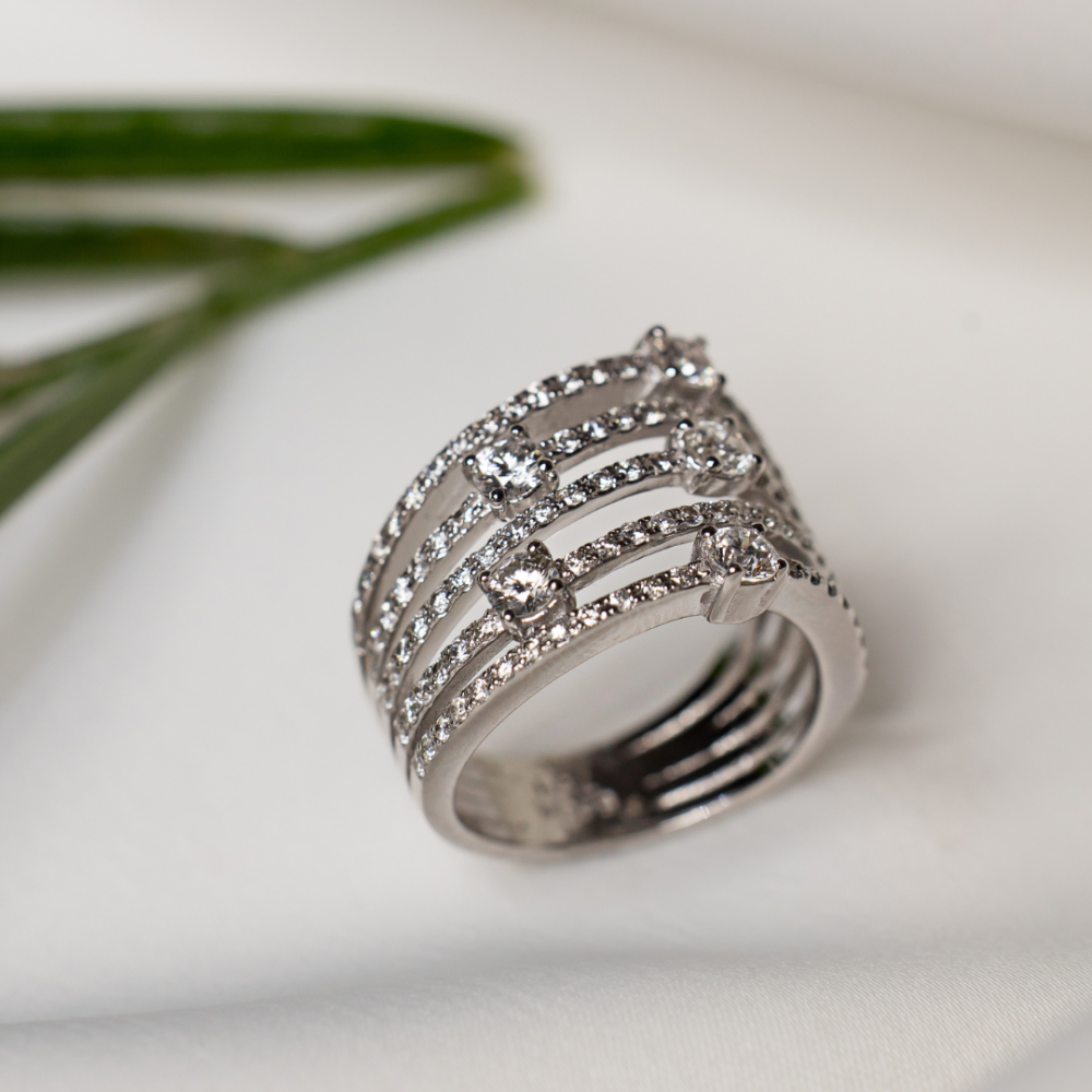 18 K white gold ring with round diamonds of 1.38 ct. The ring weighs 8.53 grams.