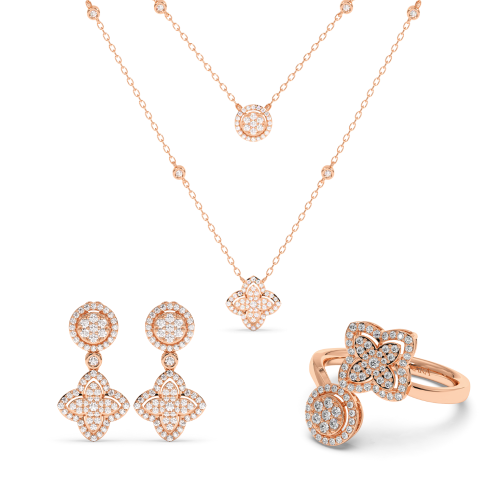 The set includes: 14K gold pendant chain with 0.39ct diamonds, 14K gold ring with 0.39ct diamonds and 14K gold earrings with 0.78ct diamonds. The total weight of the set is approximately 10.50 grams. Go to "SPECIFICATIONS" for more details about this product.