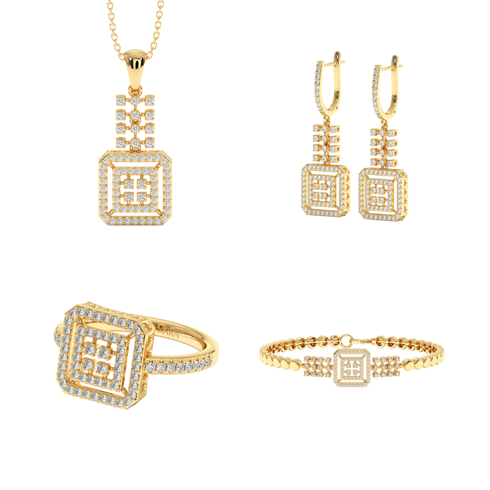 The set includes: 14K gold bracelet with 0.48ct diamonds, 14K gold pendant chain with 0.36ct diamonds, 14K gold earrings with 0.81ct diamonds and 14K gold ring with 0.34ct diamonds. The total weight of the set is approximately 30.20 grams. Go to "SPECIFICATIONS" for more details about this...