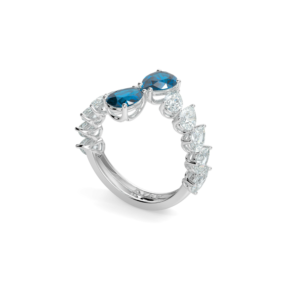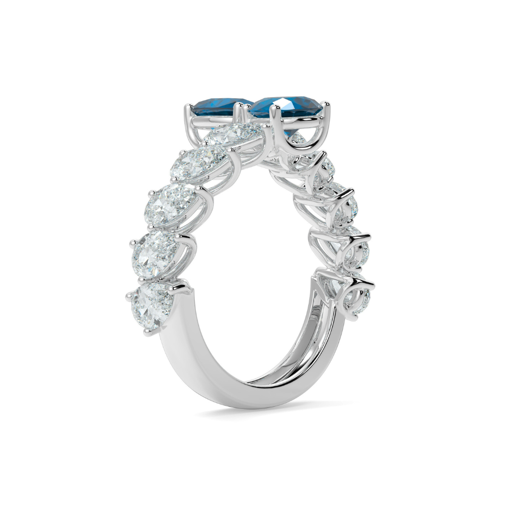 18K white gold ring with 2.30ct central London Blue Topaz and 2.04ct Pear Cut diamonds. Ring weight is 6.25 grams.