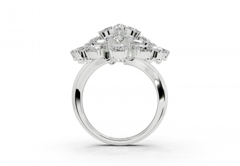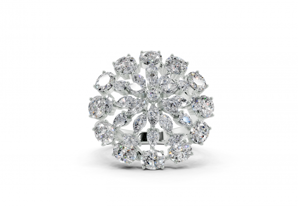 14K white gold ring with 1.54ct Oval diamonds, 0.31ct Pear Cut diamonds, 0.59ct Marquise Cut diamonds and a 0.03ct round center diamond. The weight of the ring is approximately 6.50 grams. The ring can also be made to order in 18K gold. We can modify the design according to your budget.