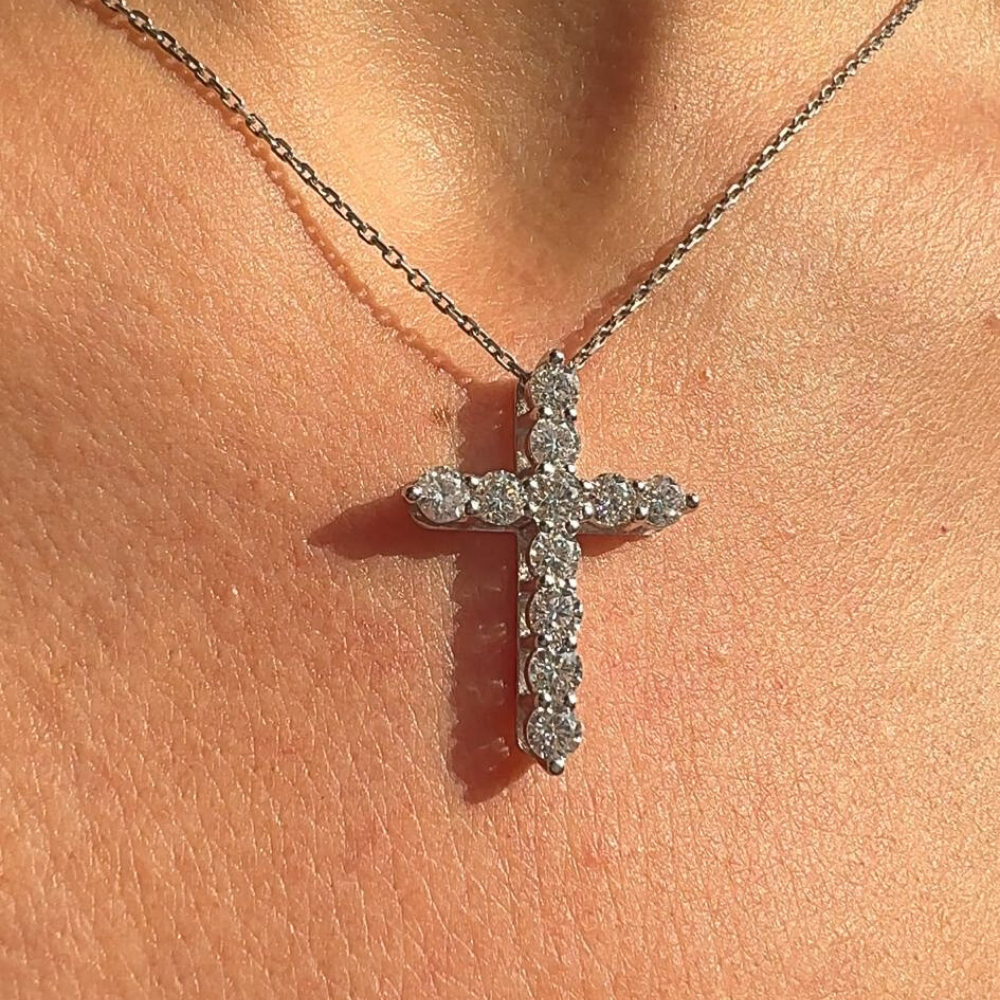 14 K white gold cross pendant with 2.69 ct diamonds. The approximate weight of the necklace is 7.14 grams.