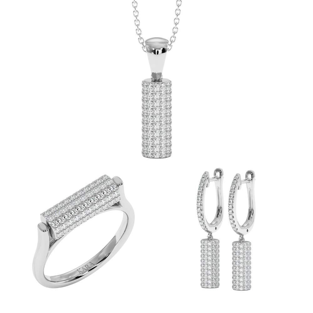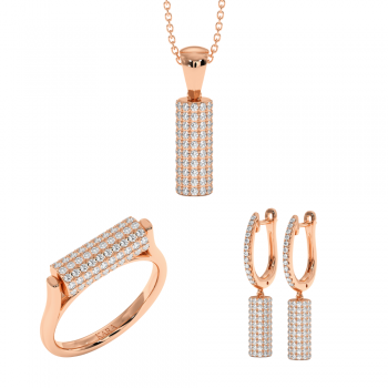 The set includes: 14K gold pendant chain with 0.78ct diamonds, 14K gold earrings with 1.37ct diamonds and 14K gold ring with 0.60ct diamonds. The total weight of the set is approximately 17.50 grams. Go to "SPECIFICATIONS" for more details about this product.