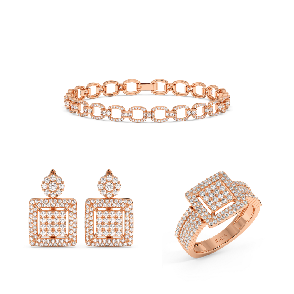 Set includes: 14K gold bracelet with 2.31ct diamonds, 14K gold earrings with 1.06ct diamonds and 14K gold ring with 0.80ct diamonds. The total weight of the set is approximately 19.40 grams. Go to "SPECIFICATIONS" for more details about this product.