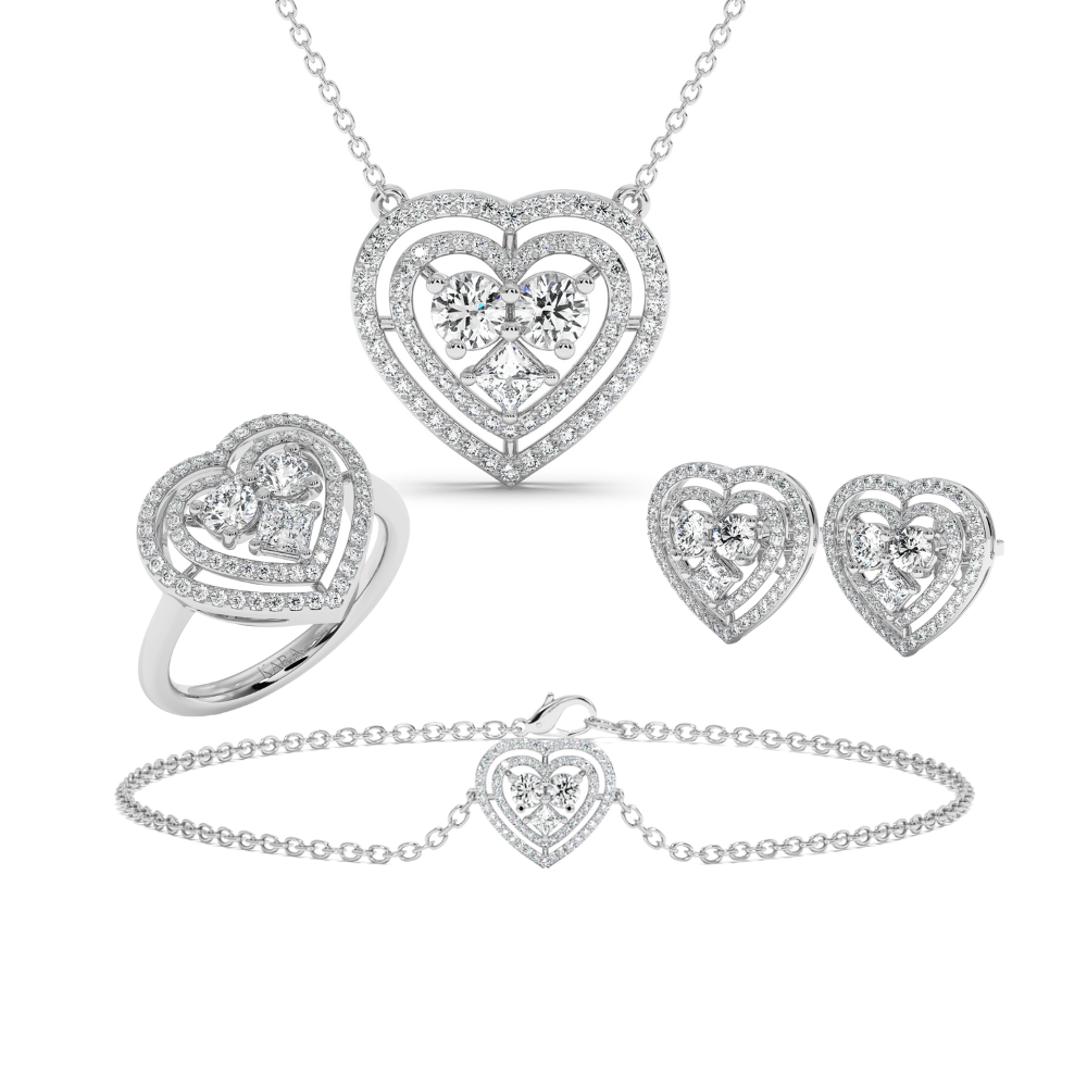The set includes: 14K gold bracelet with 0.95 ct diamonds, 14K gold pendant chain with 0.95 ct diamonds, 14K gold earrings with 1.49 ct diamonds and 14K gold ring with 0.83 ct diamonds. The total weight of the set is approximately 13.53 grams.