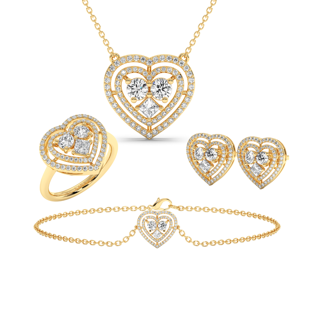 The set includes: 14K gold bracelet with 0.95 ct diamonds, 14K gold pendant chain with 0.95 ct diamonds, 14K gold earrings with 1.49 ct diamonds and 14K gold ring with 0.83 ct diamonds. The total weight of the set is approximately 13.53 grams.