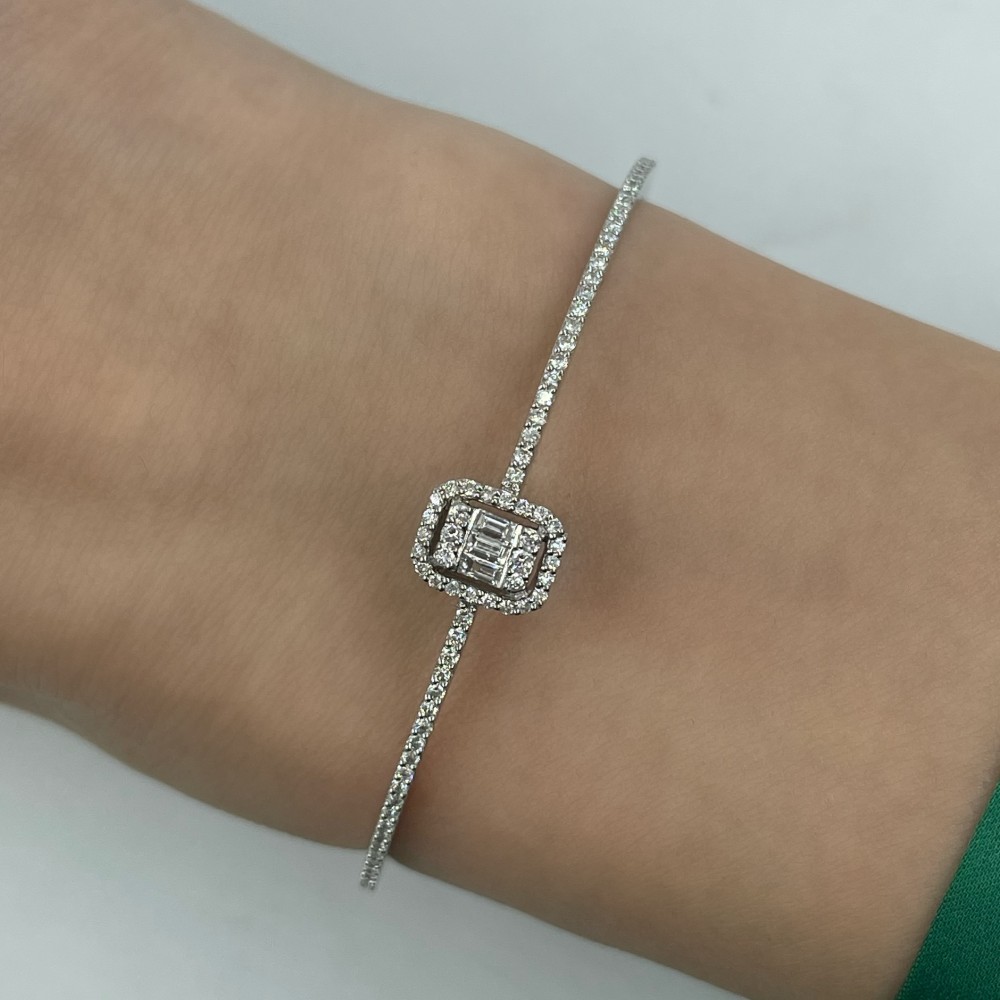 18k white gold bracelet with baguette diamonds of 0.11 ct and round diamonds of 0.64 ct. The weight of the bracelet is 8.34 grams.