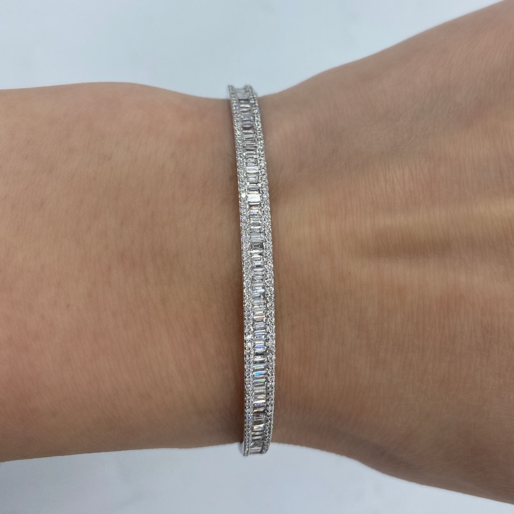 14 K white gold bracelet with baguette diamonds of 1.97 ct and round diamonds of 0.72 ct. The weight of the bracelet is 8.54 grams.