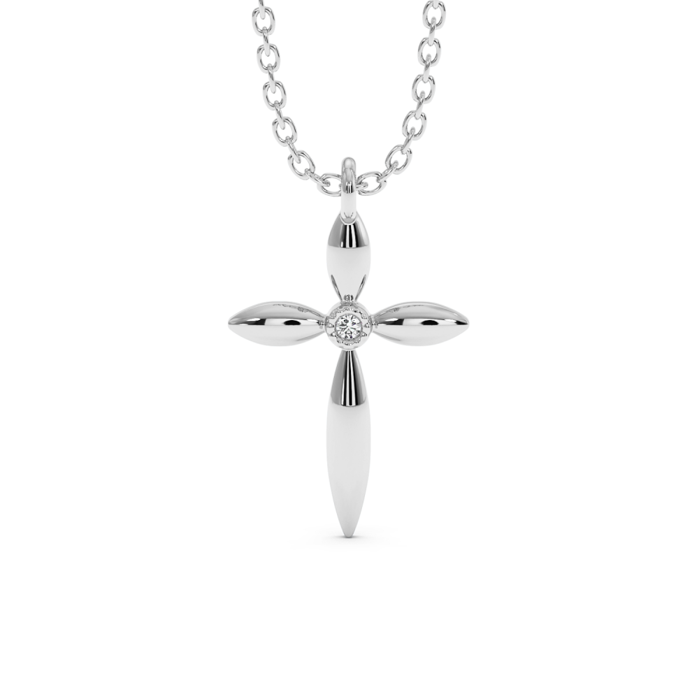 Pendant in 14K white gold, with a diamond of 0.01 ct. The weight of the pendant is 2 grams. Pendant length is 1.7 cm. We can modify the design according to your budget.
