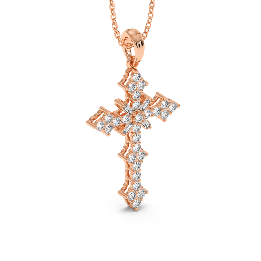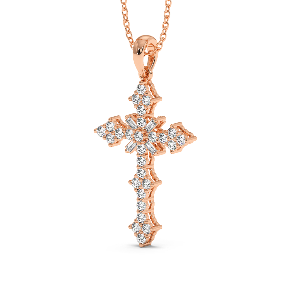 Cross pendant in 14 K gold, with baget diamonds of 0.07ct and round diamonds of 0.44ct. The weight of the cross is approximately 1.84 grams.