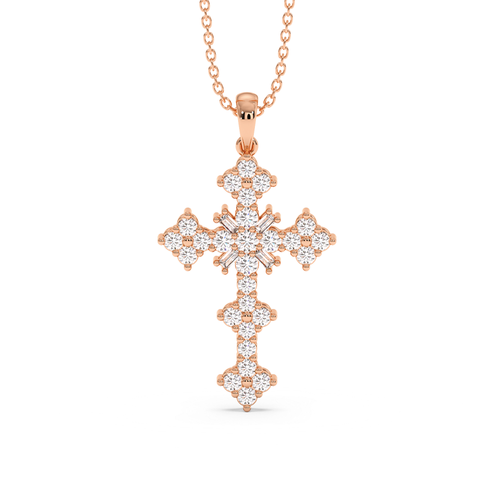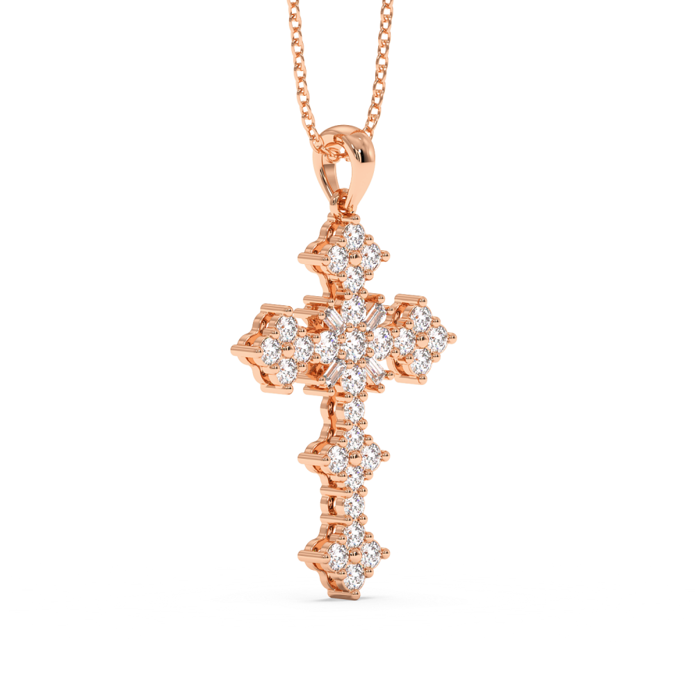 Cross pendant in 14 K gold, with baget diamonds of 0.08ct and round diamonds of 0.79ct. The weight of the cross is approximately 2.60 grams.