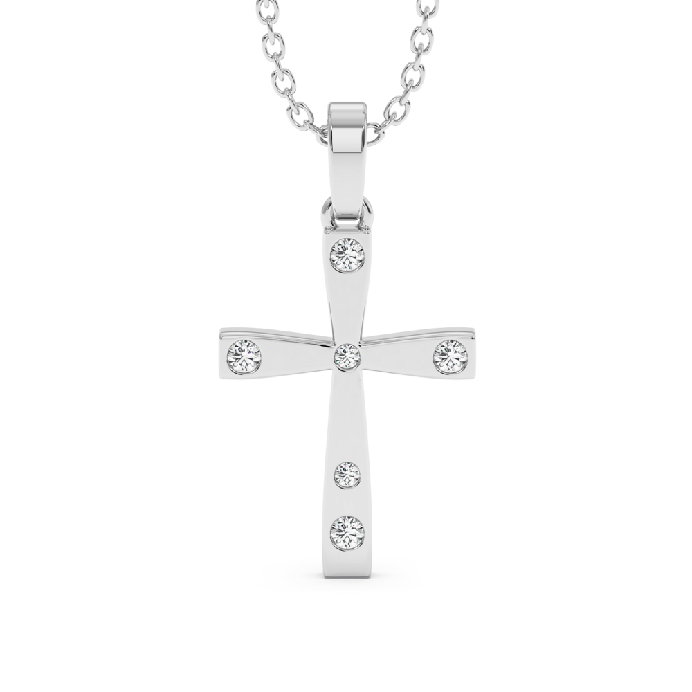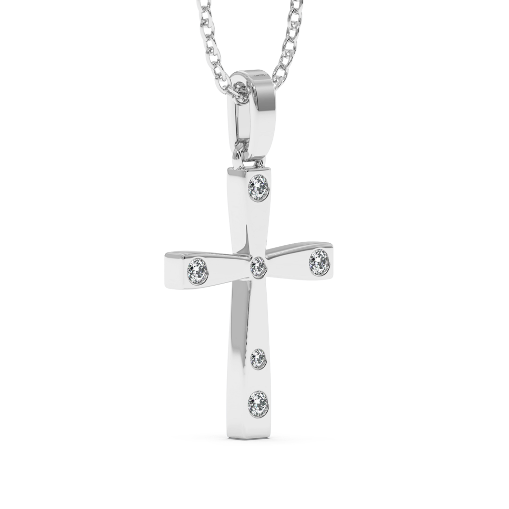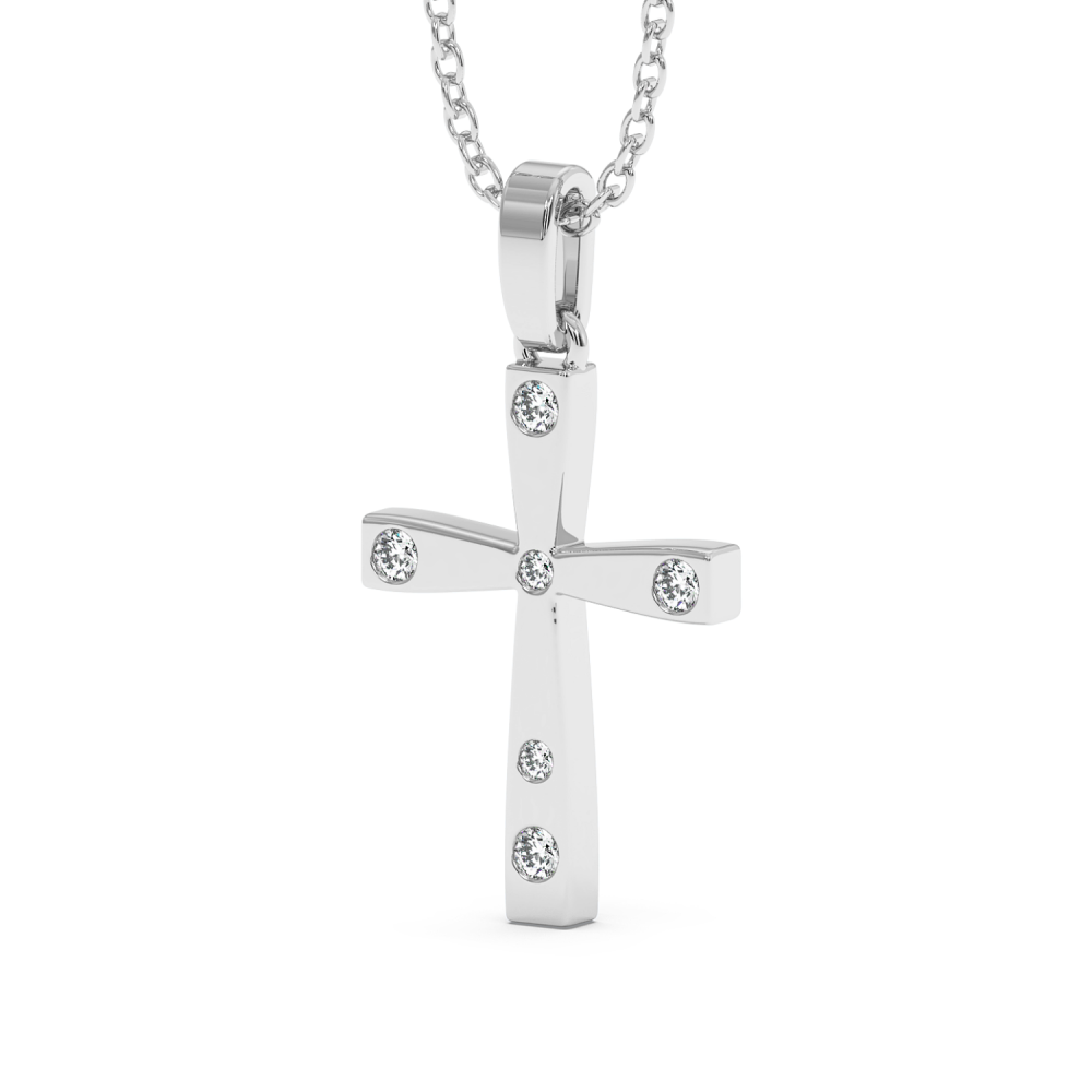 14 K white gold cross pendant with 0.10 ct diamonds. The weight of the necklace is 2.63 grams.
