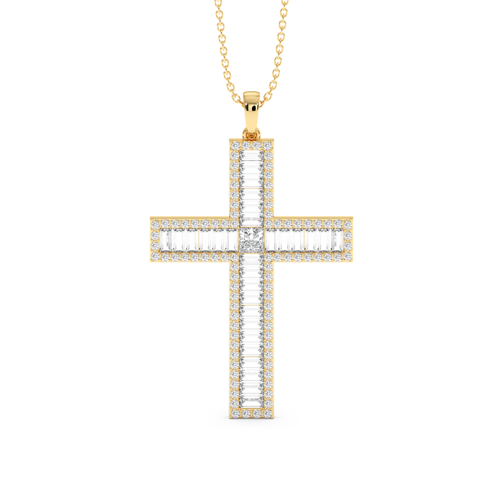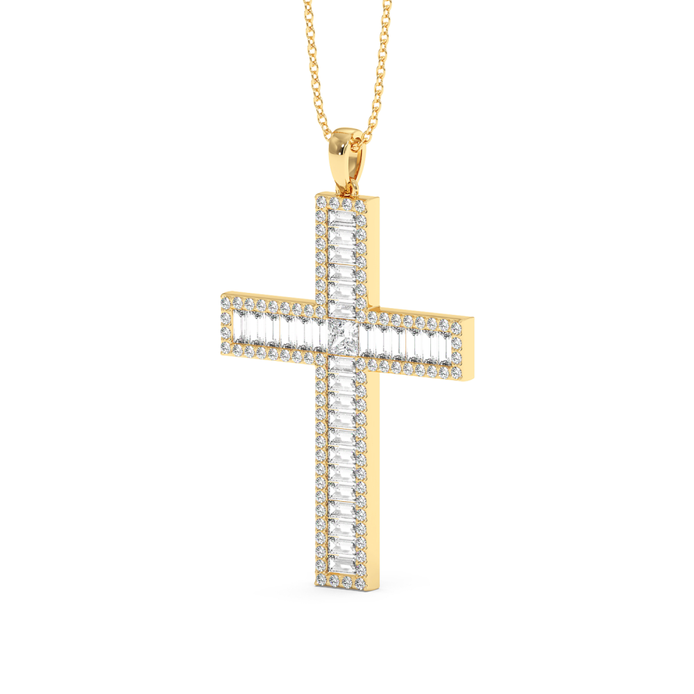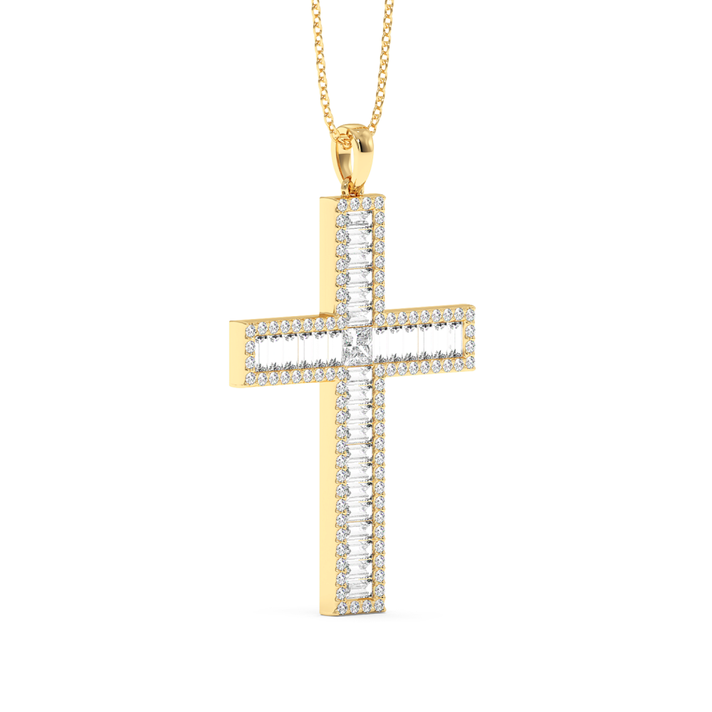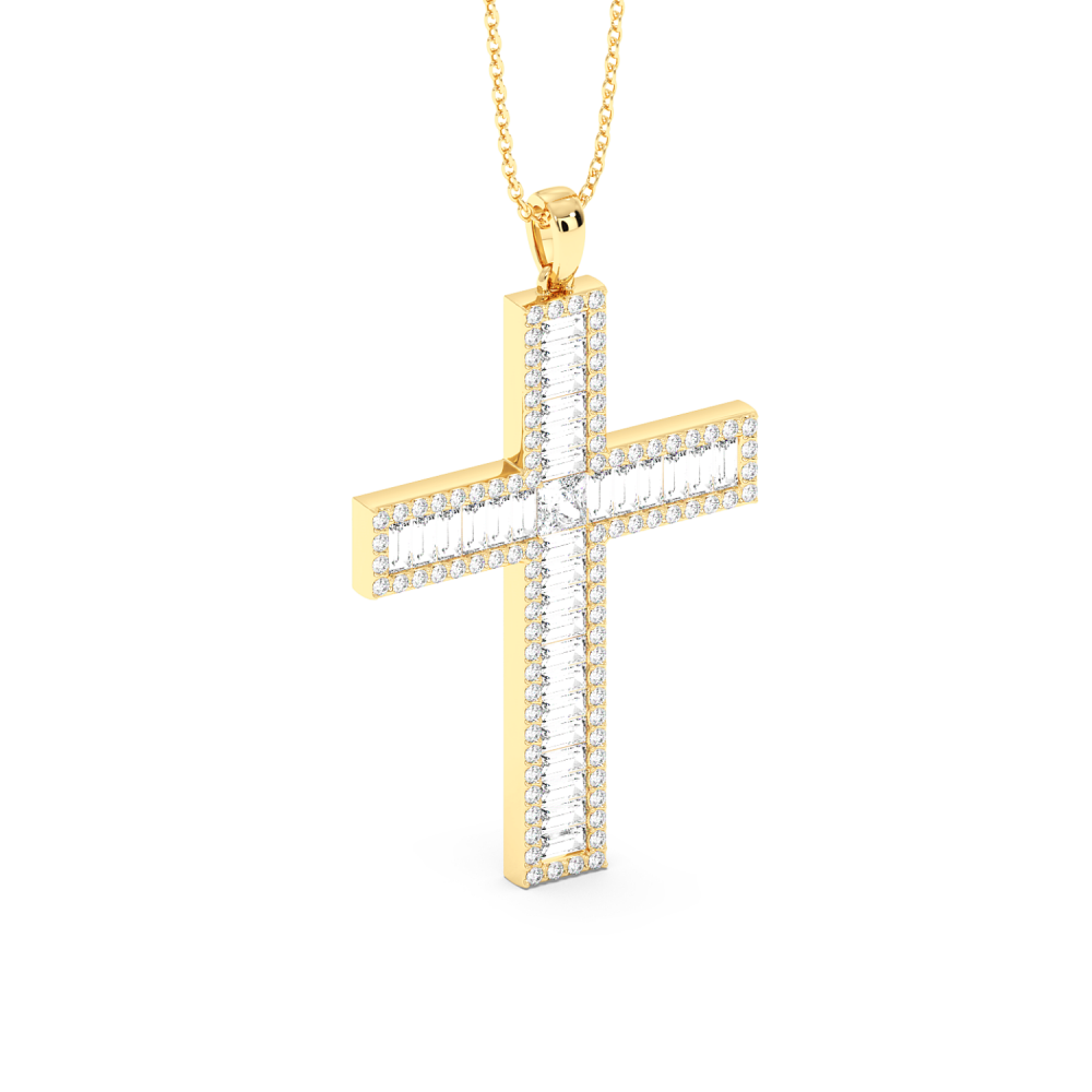Cross pendant in 14 K white gold, with Princess diamonds of 0.30 ct, baget diamonds of 1.17 ct and round diamonds of 0.71 ct.