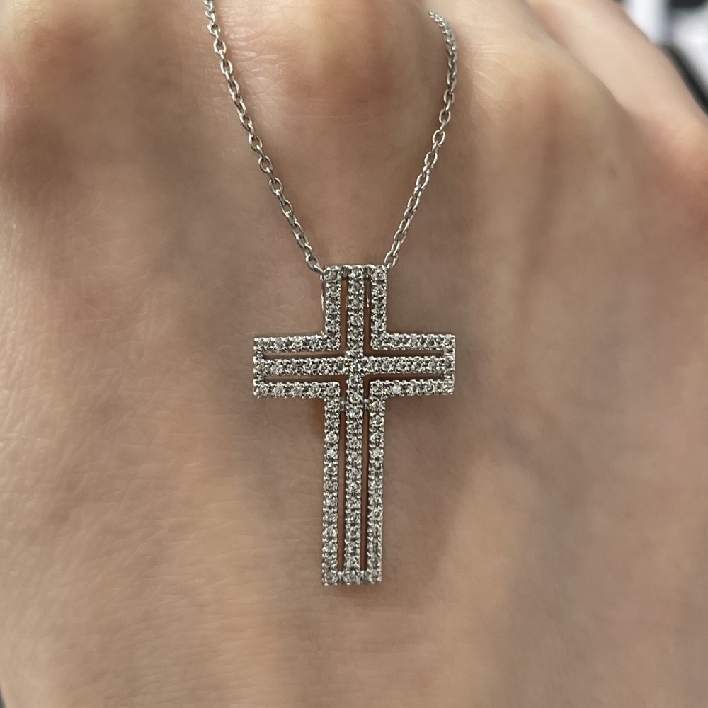 18K white gold cross pendant with 0.32 ct diamonds. The weight of the necklace is approximately 4.91 grams.