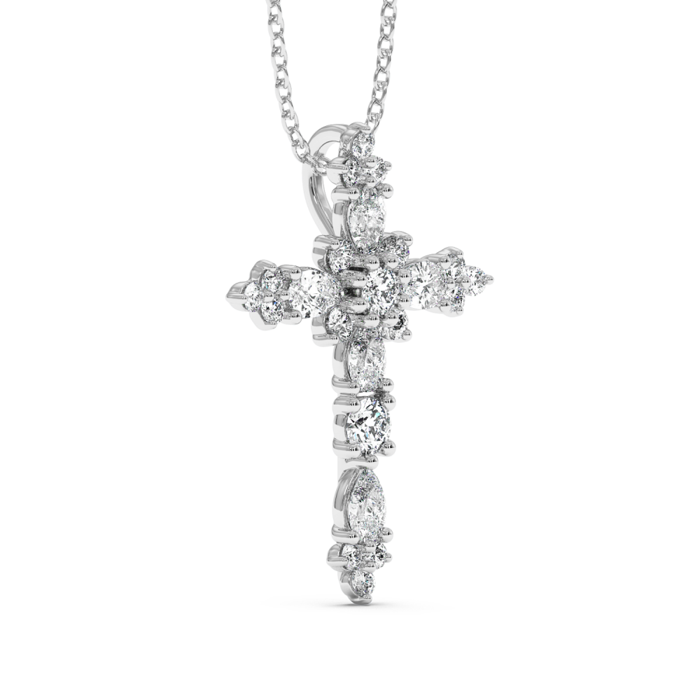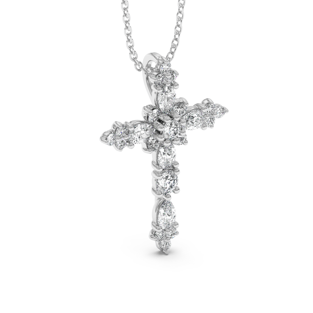 14K gold cross pendant with round diamonds of 0.43ct and Pear Cut diamonds of 0.50ct. Weight is approximately 1.80 grams. The pendant can also be made to order in 18K yellow or rose gold. We can modify the design according to your budget. We can choose the characteristics of the diamonds...