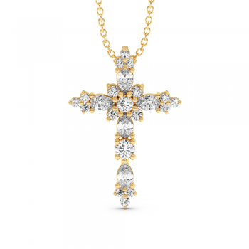 14K gold cross pendant with round diamonds of 0.43ct and Pear Cut diamonds of 0.50ct. Weight is approximately 1.80 grams.