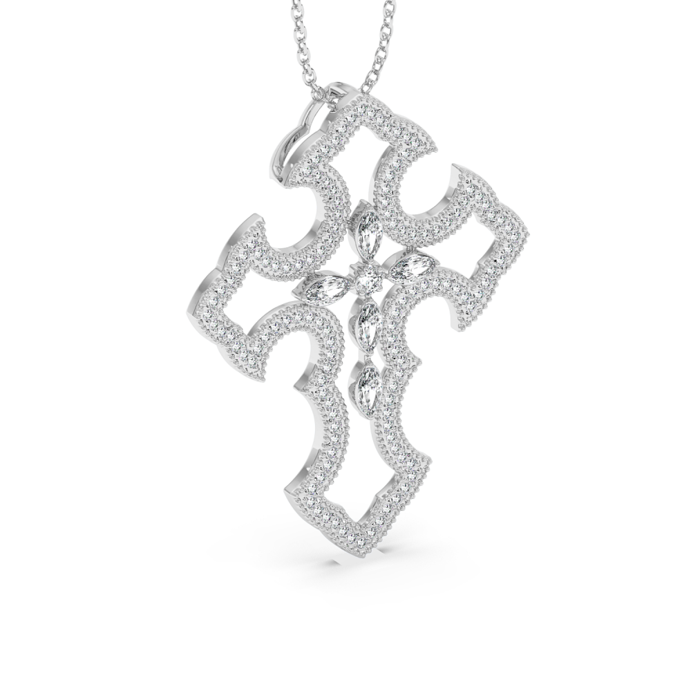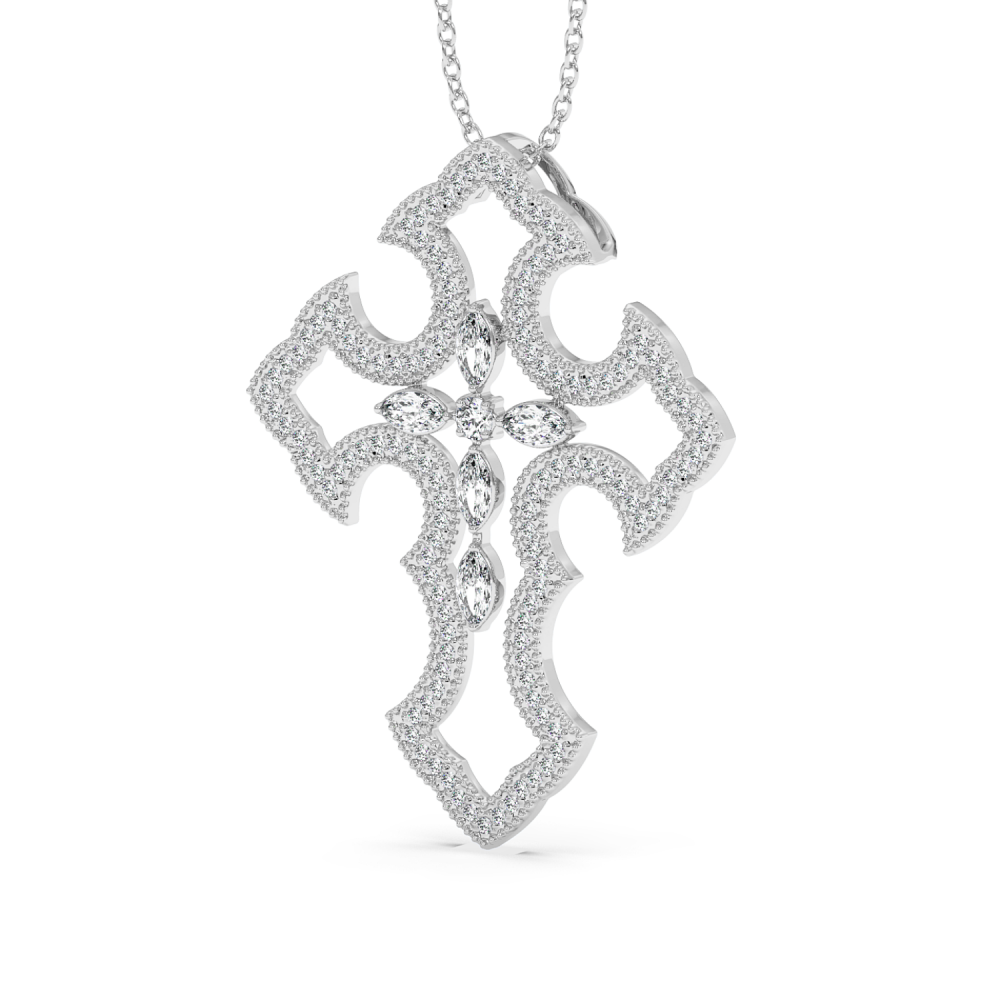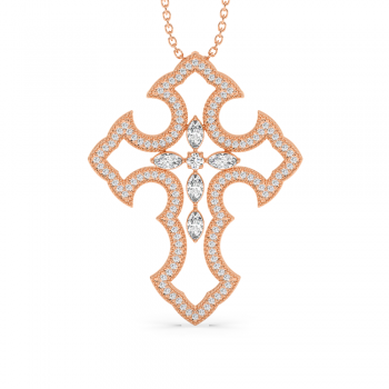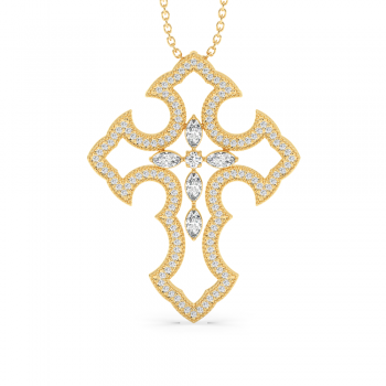Cross pendant in 14 K gold, with 0.45ct Marquise Cut diamonds and 0.40ct round diamonds. The weight of the cross is approximately 4 grams. Go to "SPECIFICATIONS" for more details about this product.