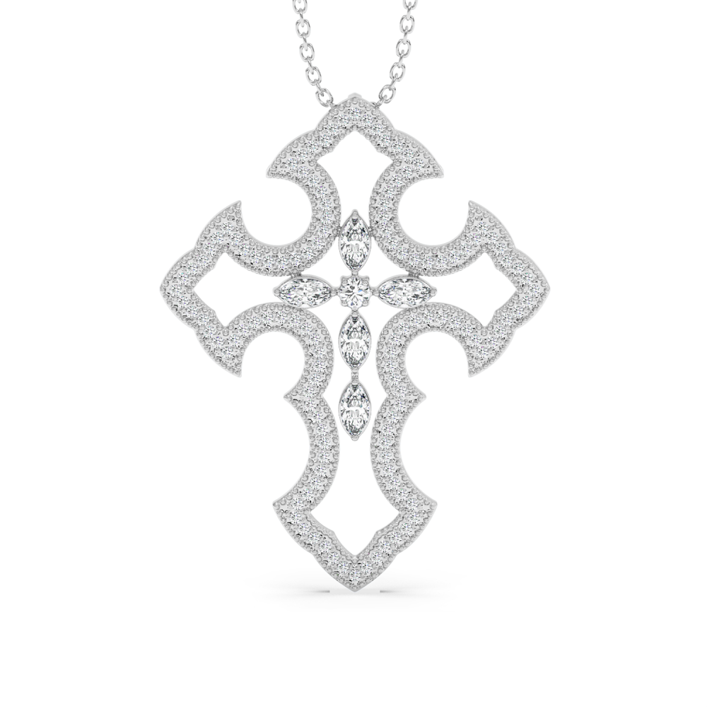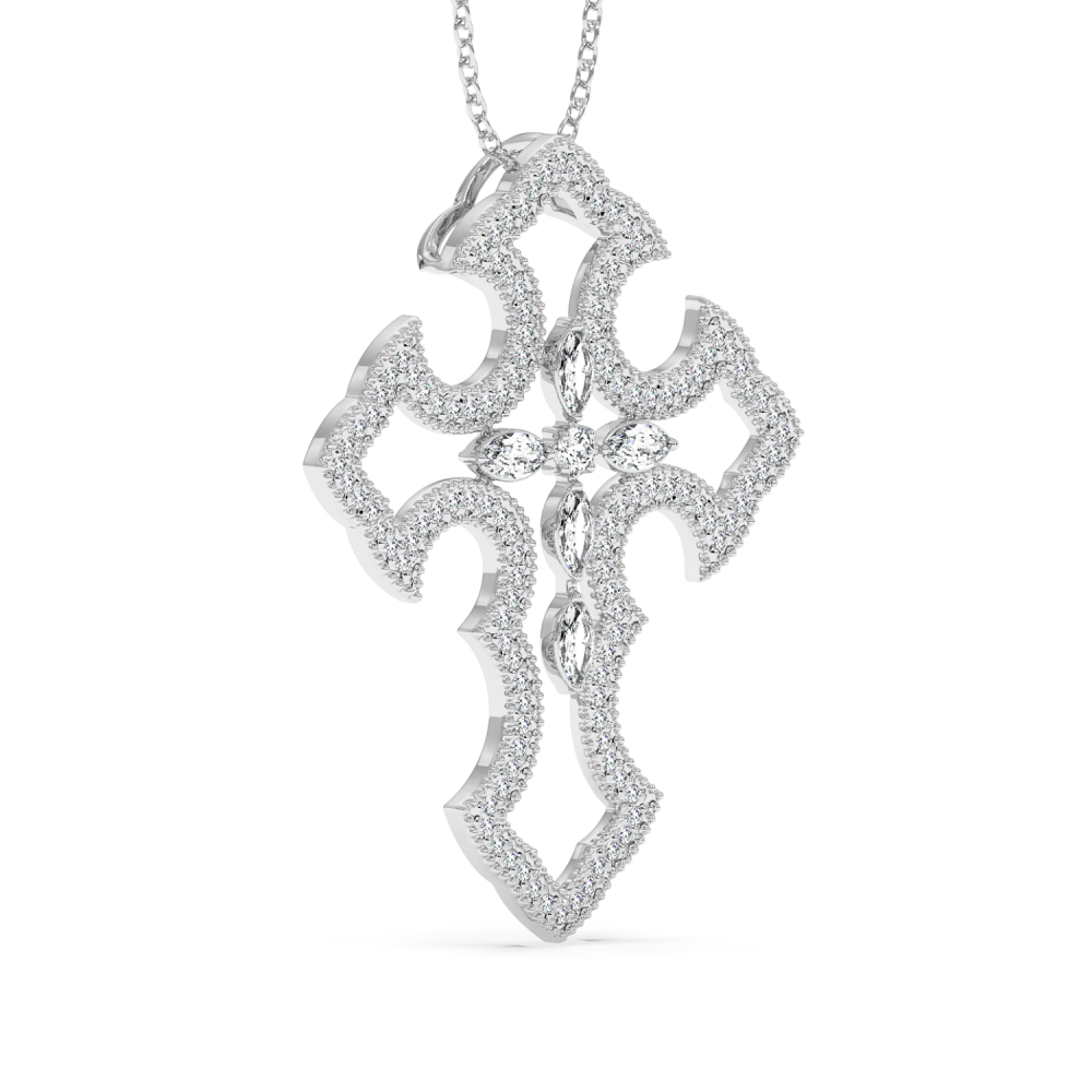 Cross pendant in 14 K gold, with 0.45ct Marquise Cut diamonds and 0.40ct round diamonds. The weight of the cross is approximately 4 grams.
