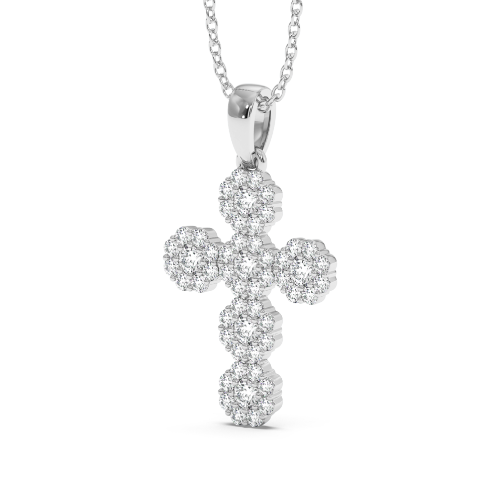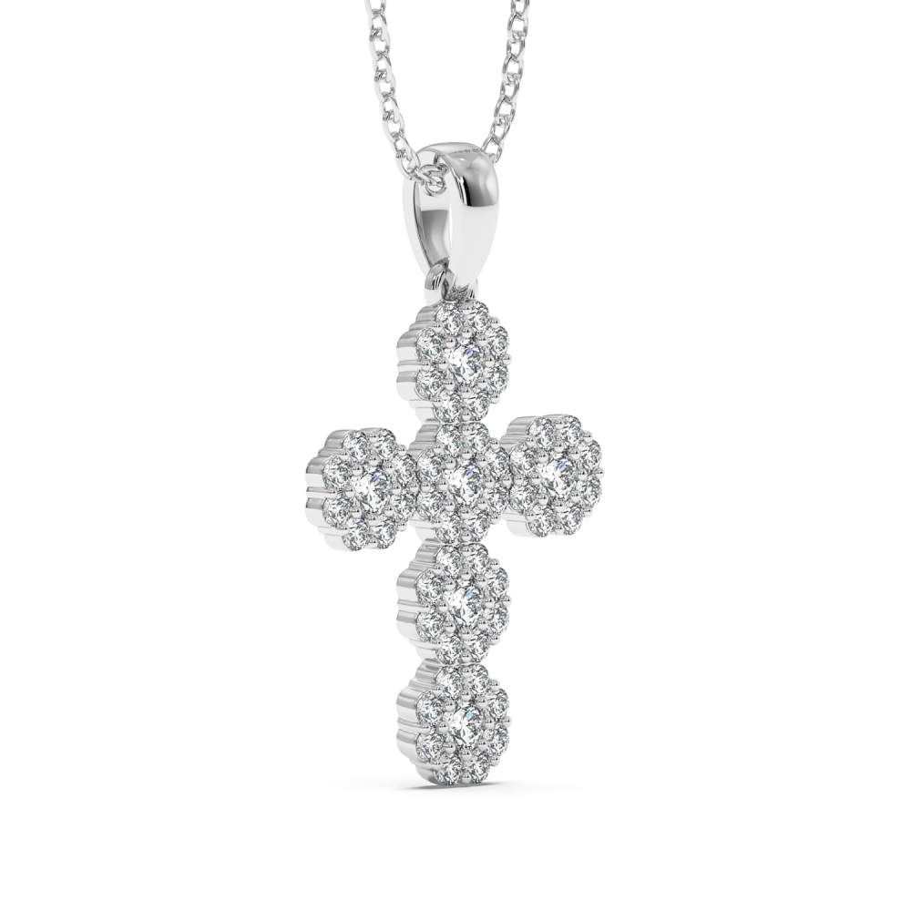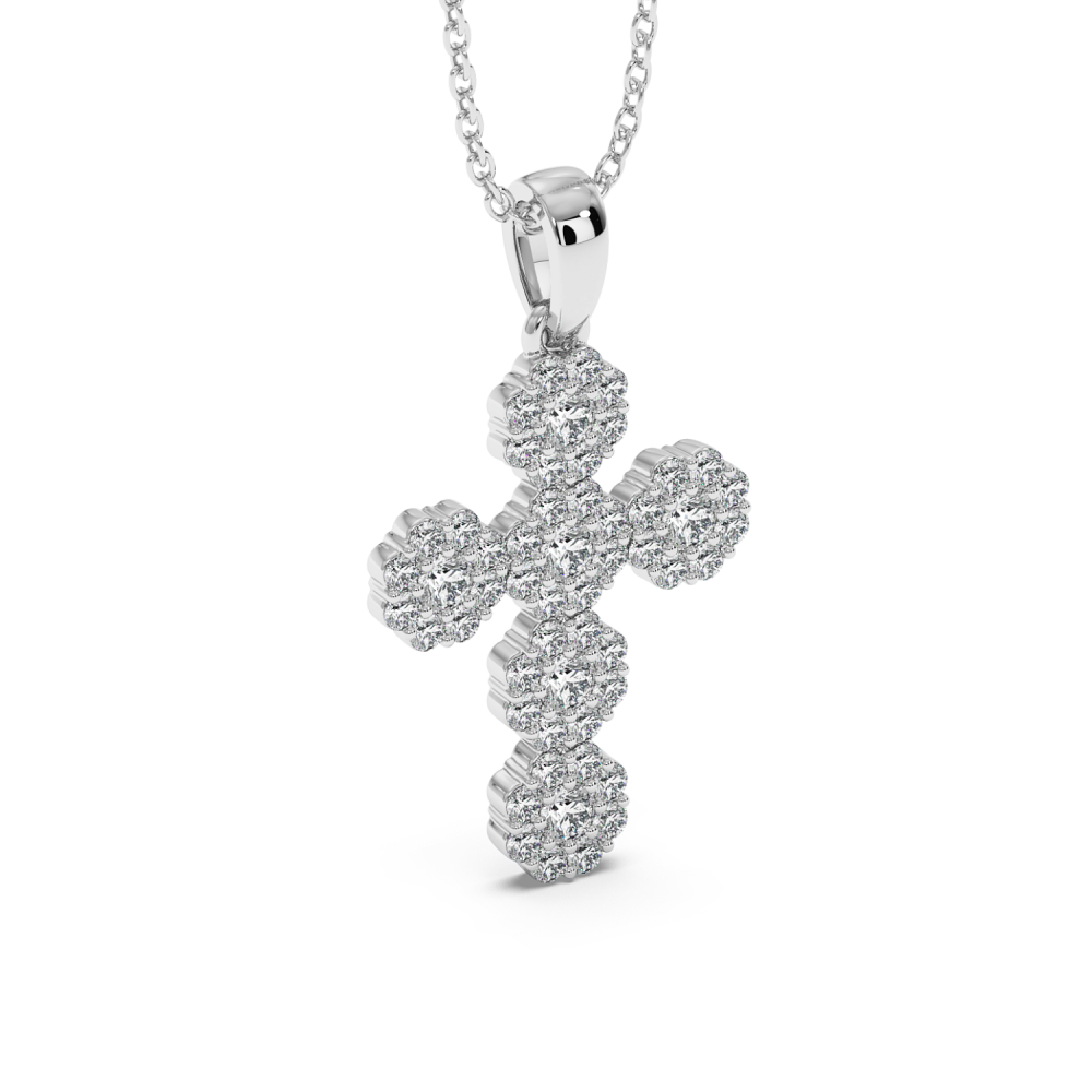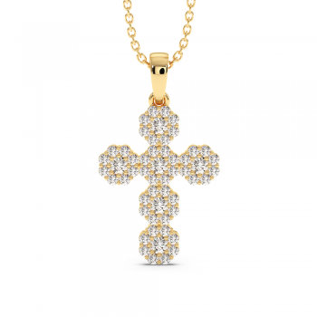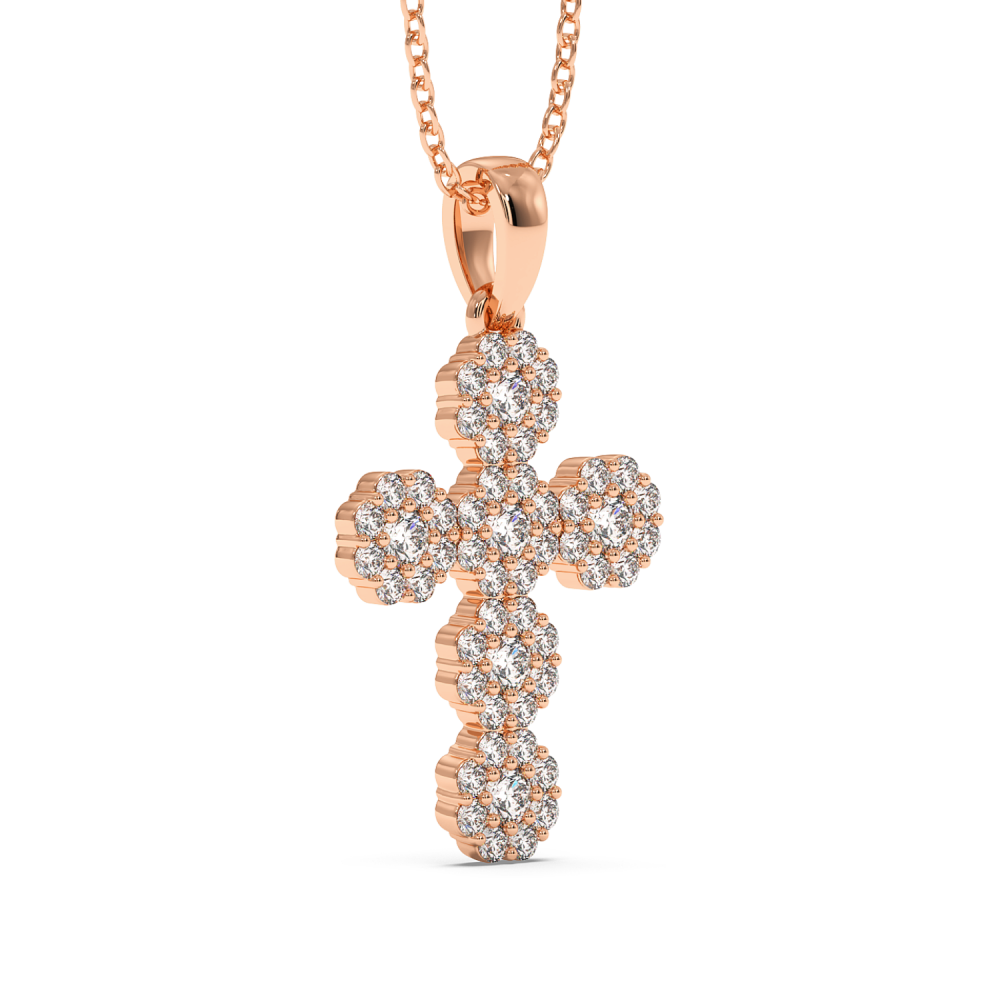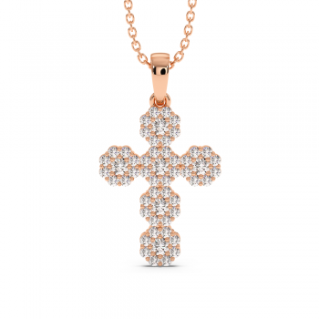 18K rose gold cross pendant with 0.62 ct diamonds. The weight of the necklace is approximately 2.28 grams.