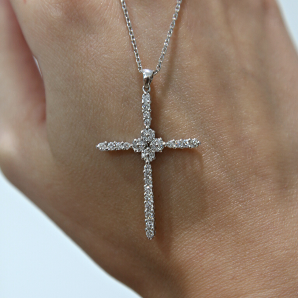 14 K white gold cross pendant with 0.75 ct diamonds. The weight of the necklace is 5.39 grams. Go to "SPECIFICATIONS" for more details about this product. For a correct diamond valuation, please refer to the chart below: