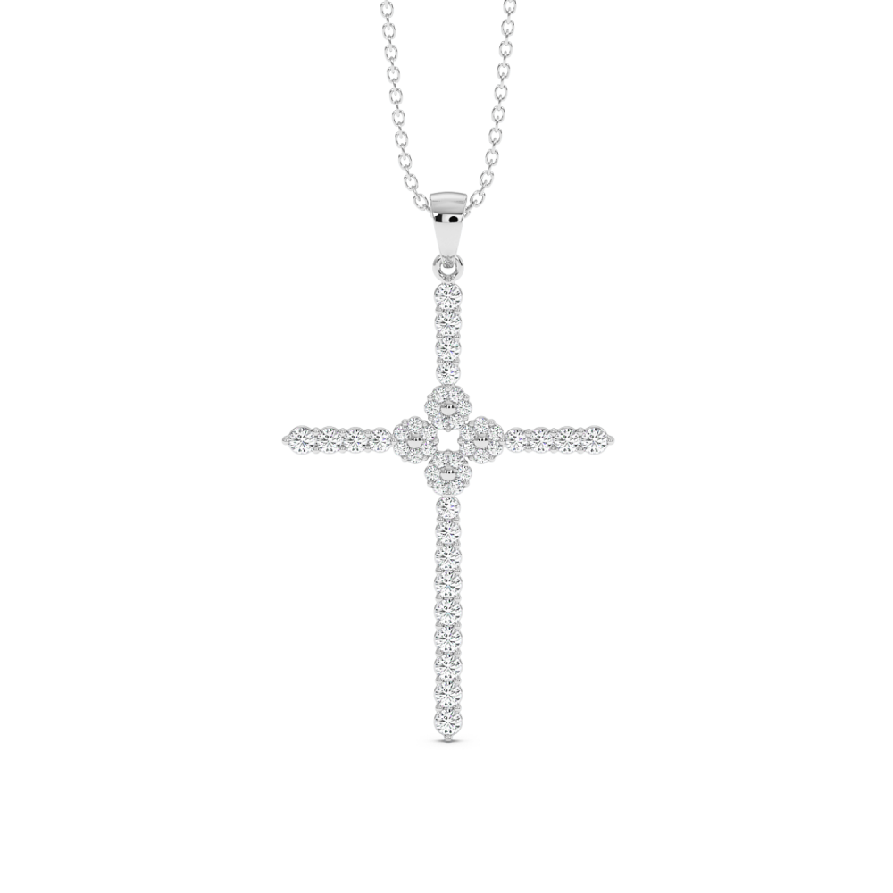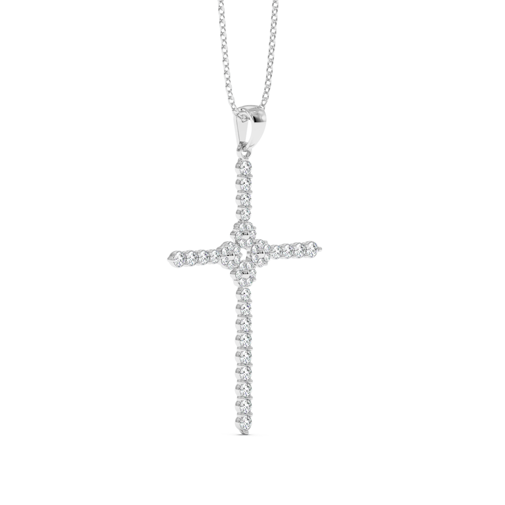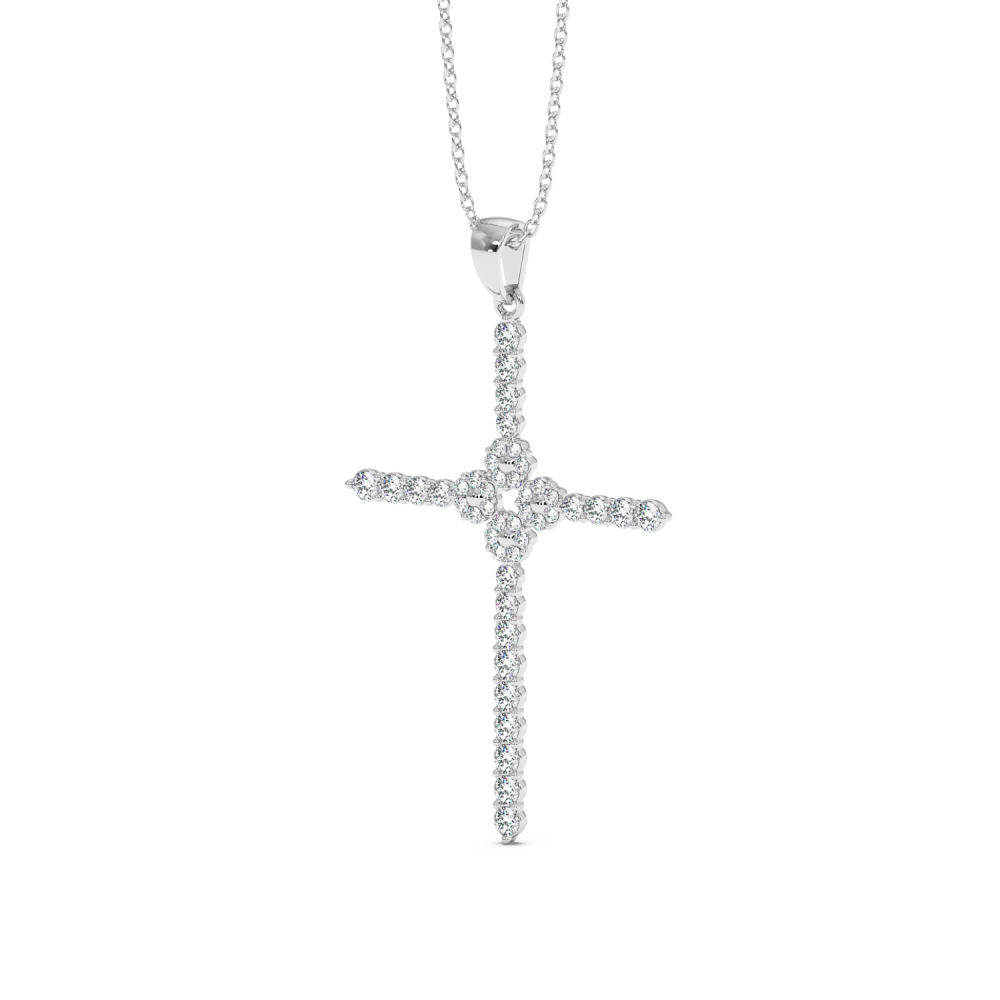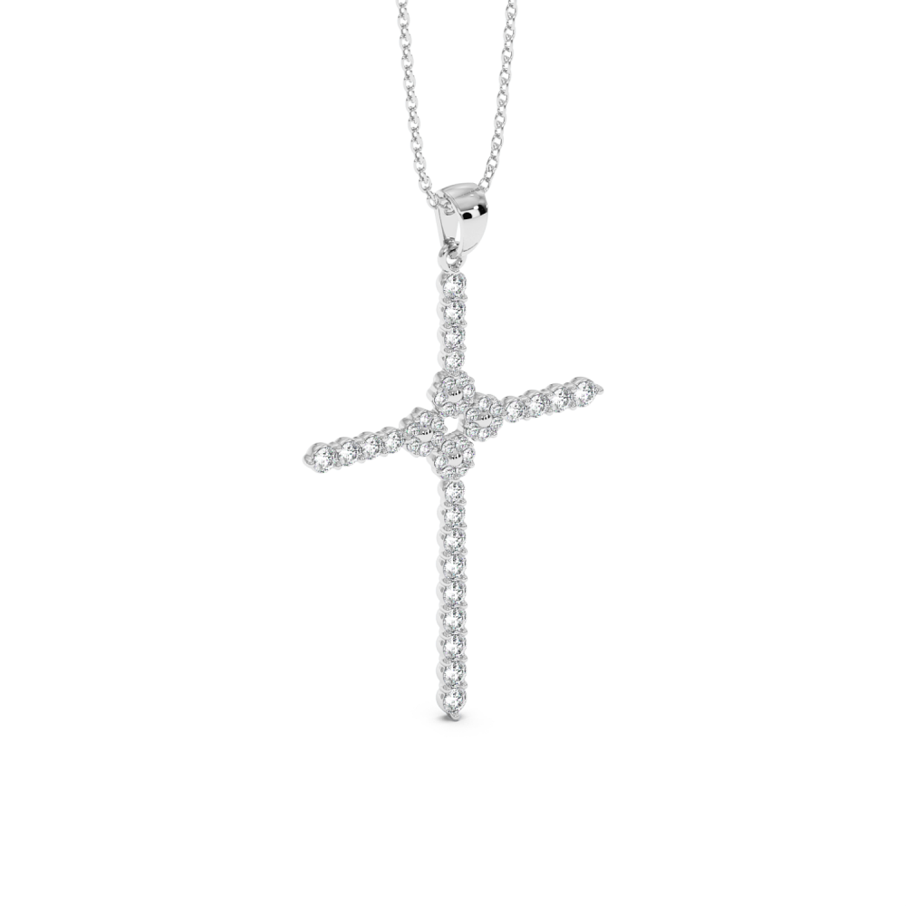 14 K white gold cross pendant with 0.75 ct diamonds. The weight of the necklace is 5.39 grams.