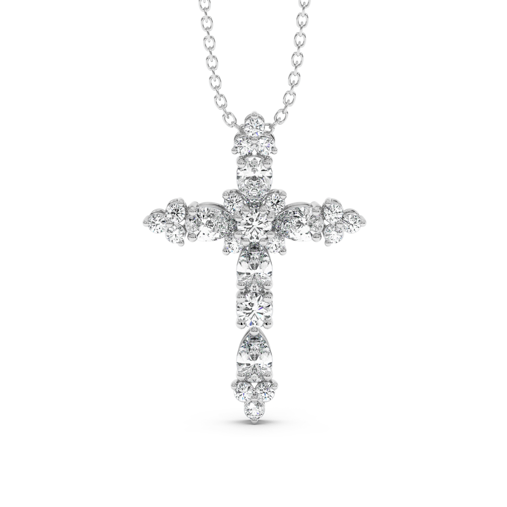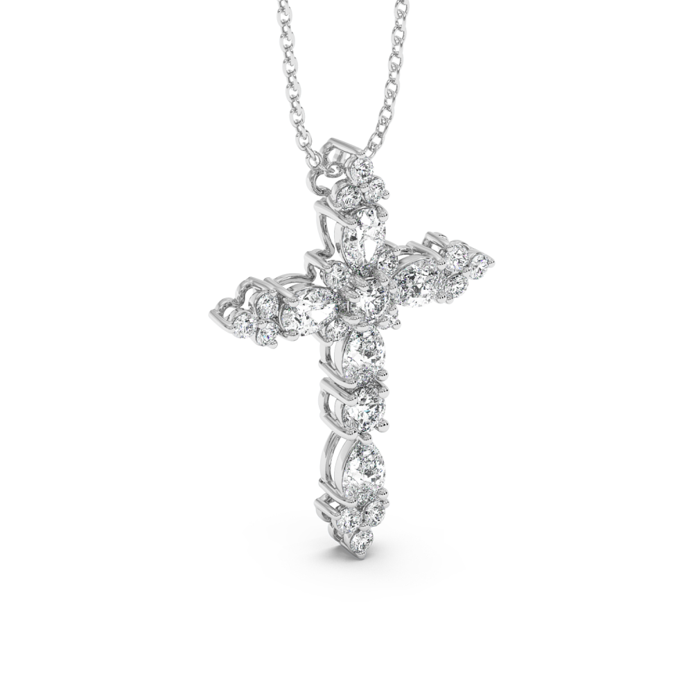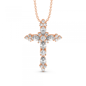 Cross pendant in 14 K gold, with pear diamonds of 0.83 ct and round diamonds of 0.22 ct. The weight of the cross is approximately 3.5 grams. Go to "SPECIFICATIONS" for more details about this product.