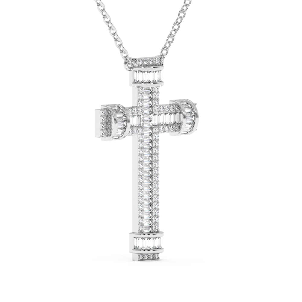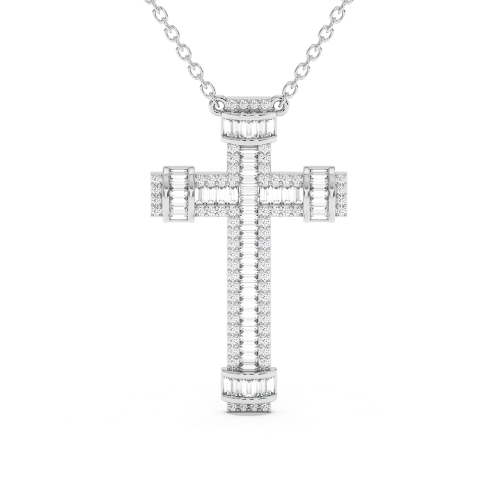 14 K gold cross pendant with 1.02ct baget diamonds and 0.26ct round diamonds. The weight of the cross is approximately 4.20 grams.