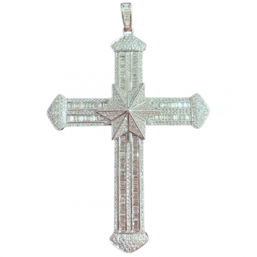 Diamond Cross pendant in 14 K white gold, with 3.54 ct round diamonds and 4.16 ct baget diamonds. The weight of the pendant is approx 34.13 grams.