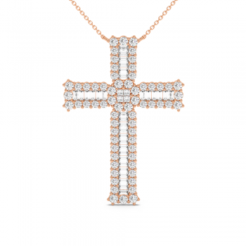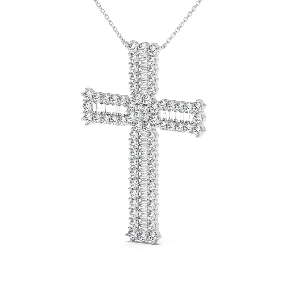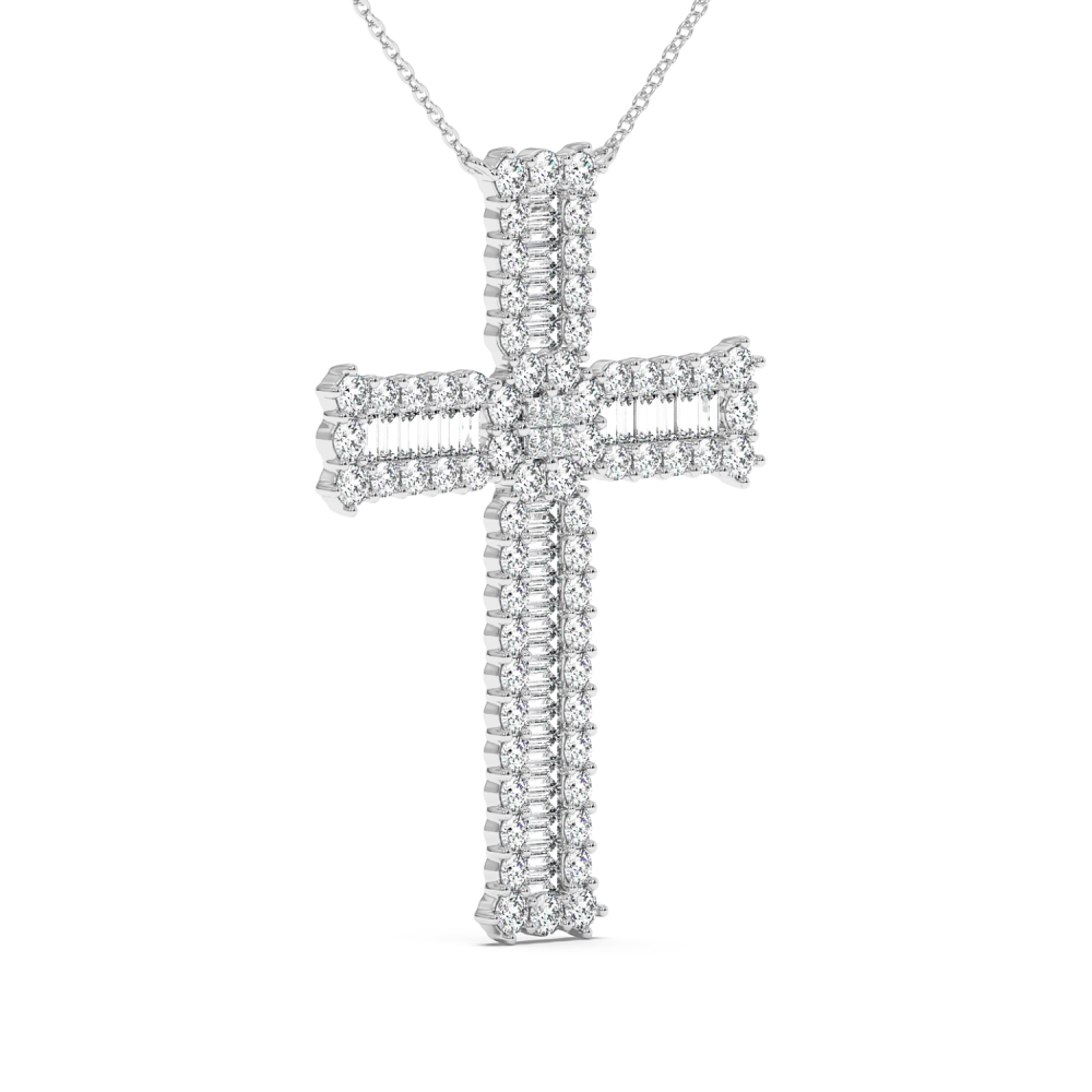 Cross pendant in 14 K gold, with Baget Diamonds of 0.50 ct, Princess Diamonds of 0.08 ct and Round Diamonds of 1.82 ct. The weight of the cross is approximately 6.20 grams.