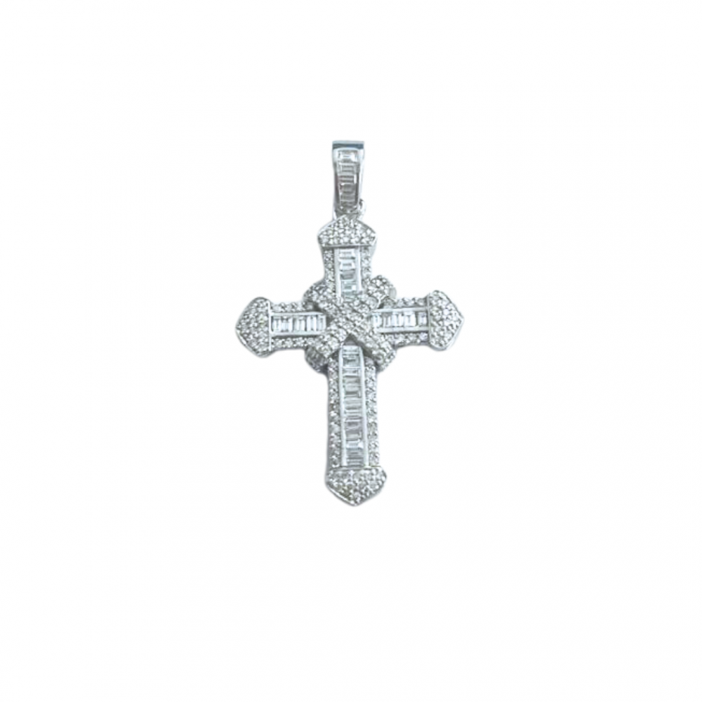 Cross pendant in 14 K white gold with 0.66 ct baguette diamonds and 0.80 ct round diamonds. The weight of the cross is 6.30 grams. The length of the cross, including the ring, is 4 cm.