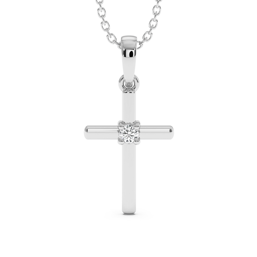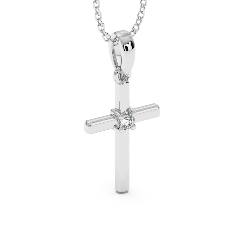 14 K white gold cross pendant with 0.05 ct diamond. The weight of the necklace is 1.89 grams.