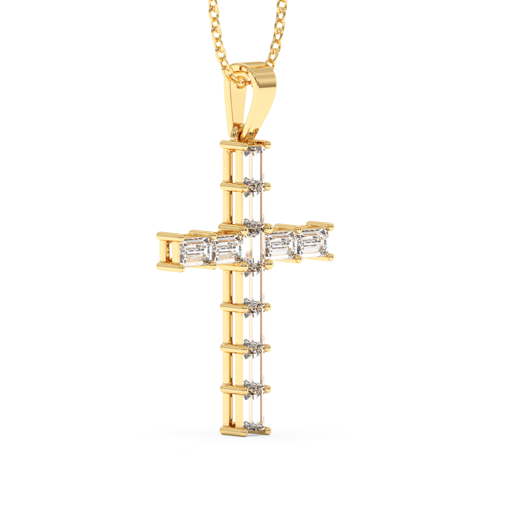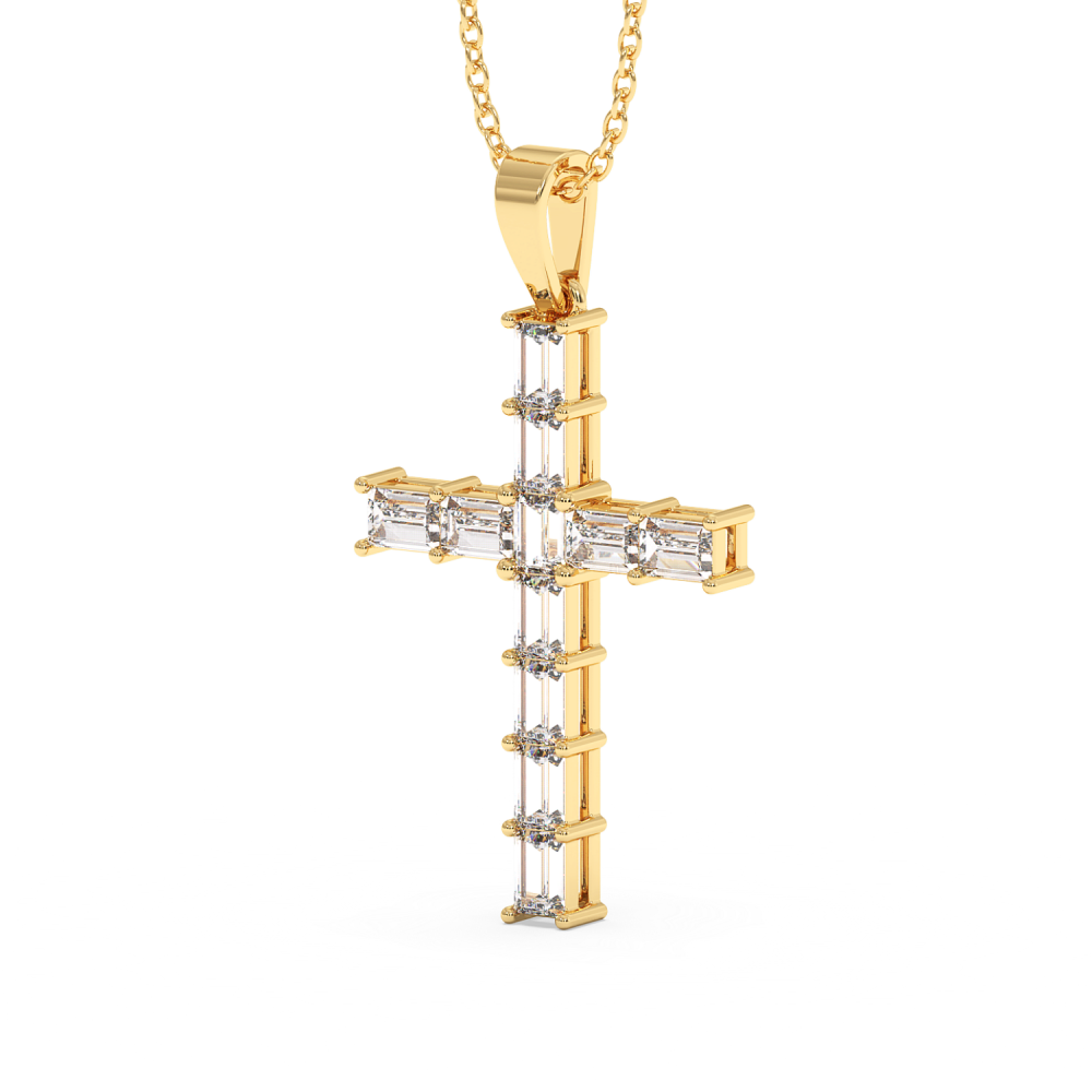 Cross pendant in 14 K gold with 1.11ct baget diamonds. The weight of the cross is approximately 1.80 grams. Go to "SPECIFICATIONS" for more details about this product.