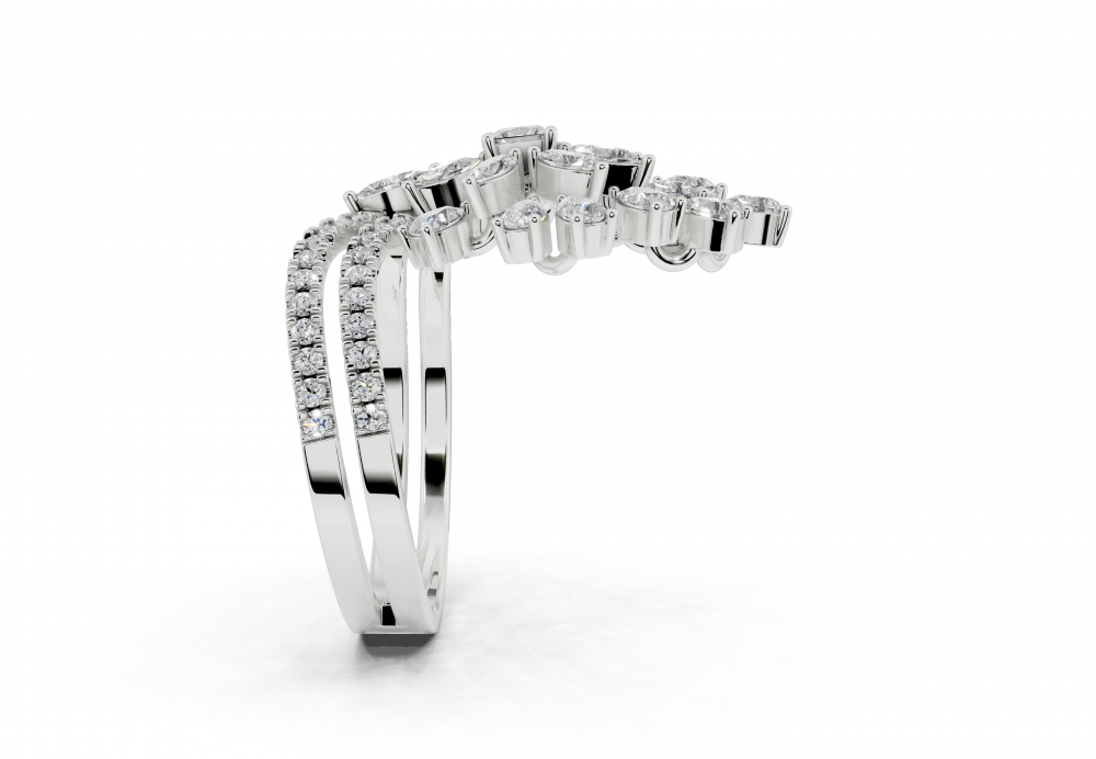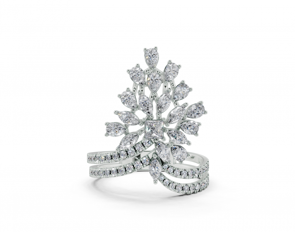 14K white gold ring with 0.12 ct Princess Cut diamond, 0.52 ct Pear Cut diamonds, 0.30 ct Marquise Cut diamonds and 0.24 ct Round diamonds. The weight of the ring is approximately 4.30 grams.