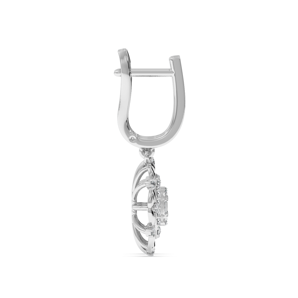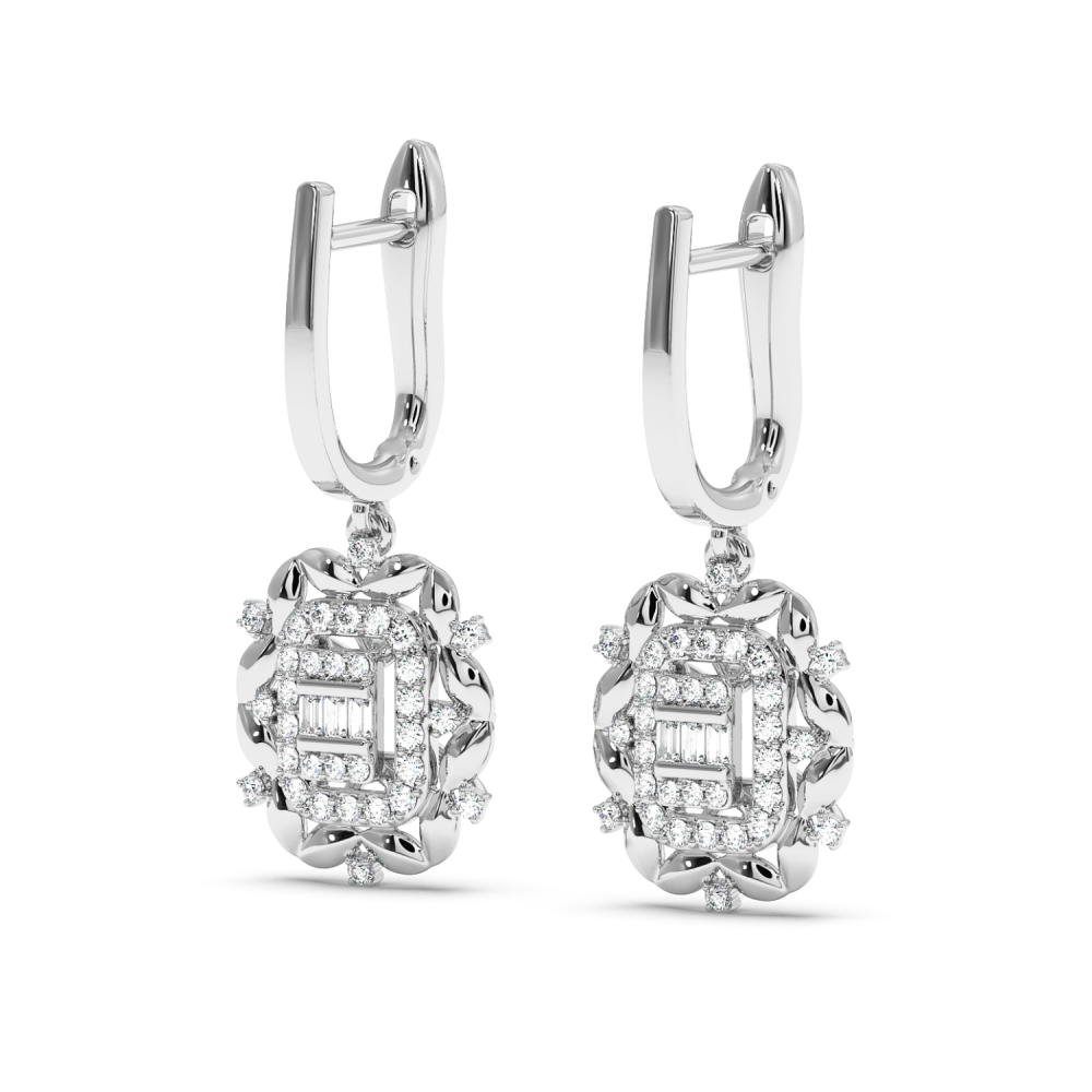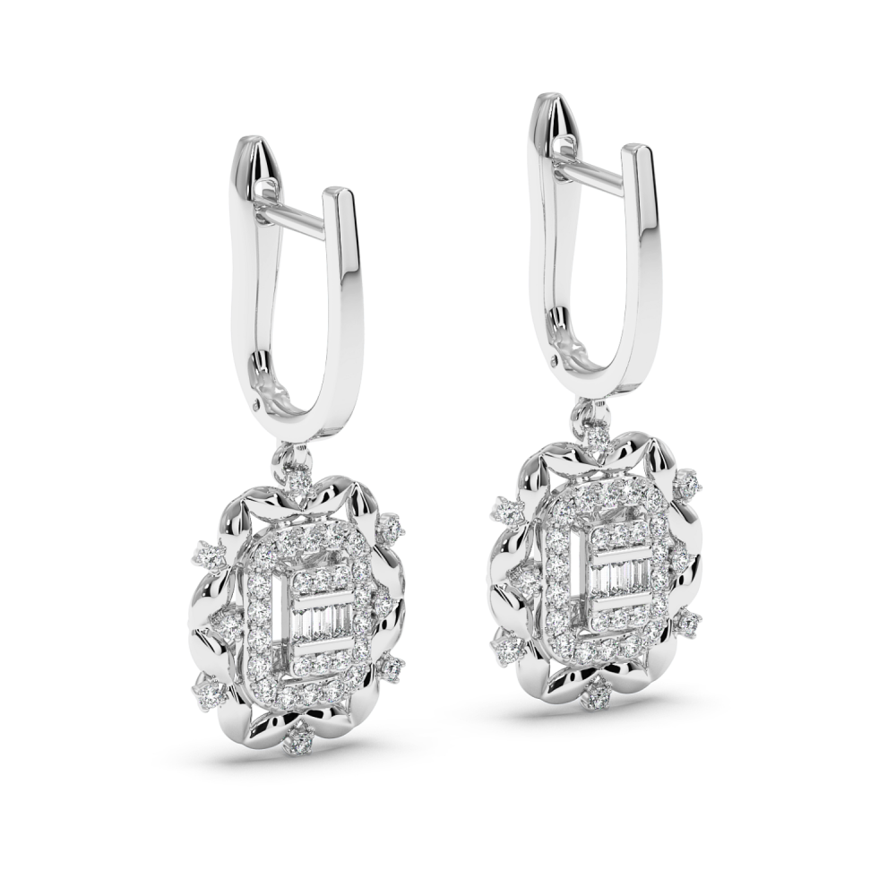 14 K white gold earrings, with Baget Diamonds of 0.04 ct and Round Diamonds of 0.38 ct. The weight of the earrings is approx 3.91 grams and the length is 2.70 cm