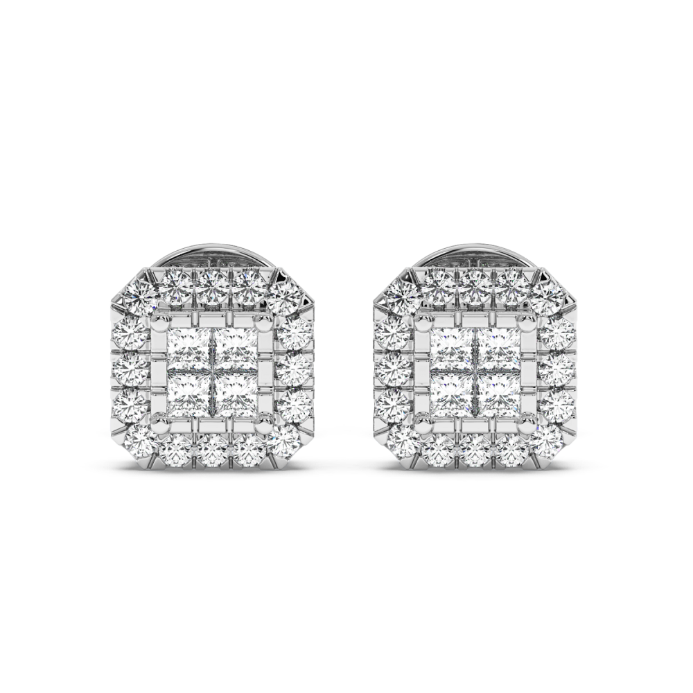 14 K white gold earrings with 0.21 ct Princess Diamonds and 0.16 ct round diamonds. The weight of the earrings is 2.7 grams.