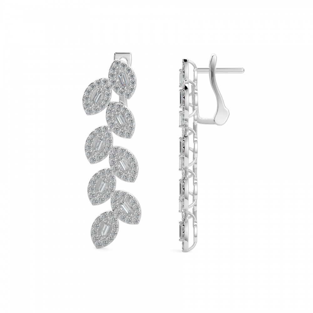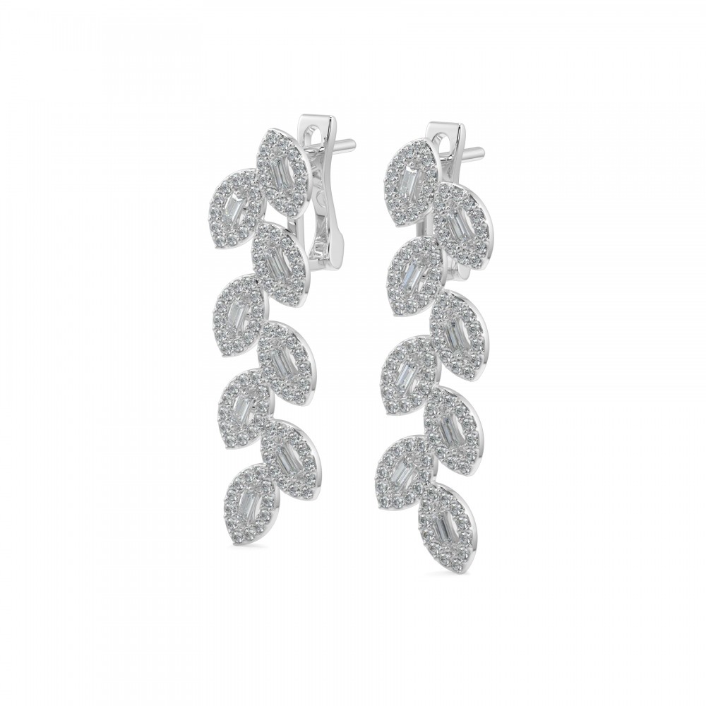 14 K white gold diamond earrings with 0.27 ct baget diamonds and 0.48 ct diamonds. The weight of the earrings is approximately 5.98 grams.