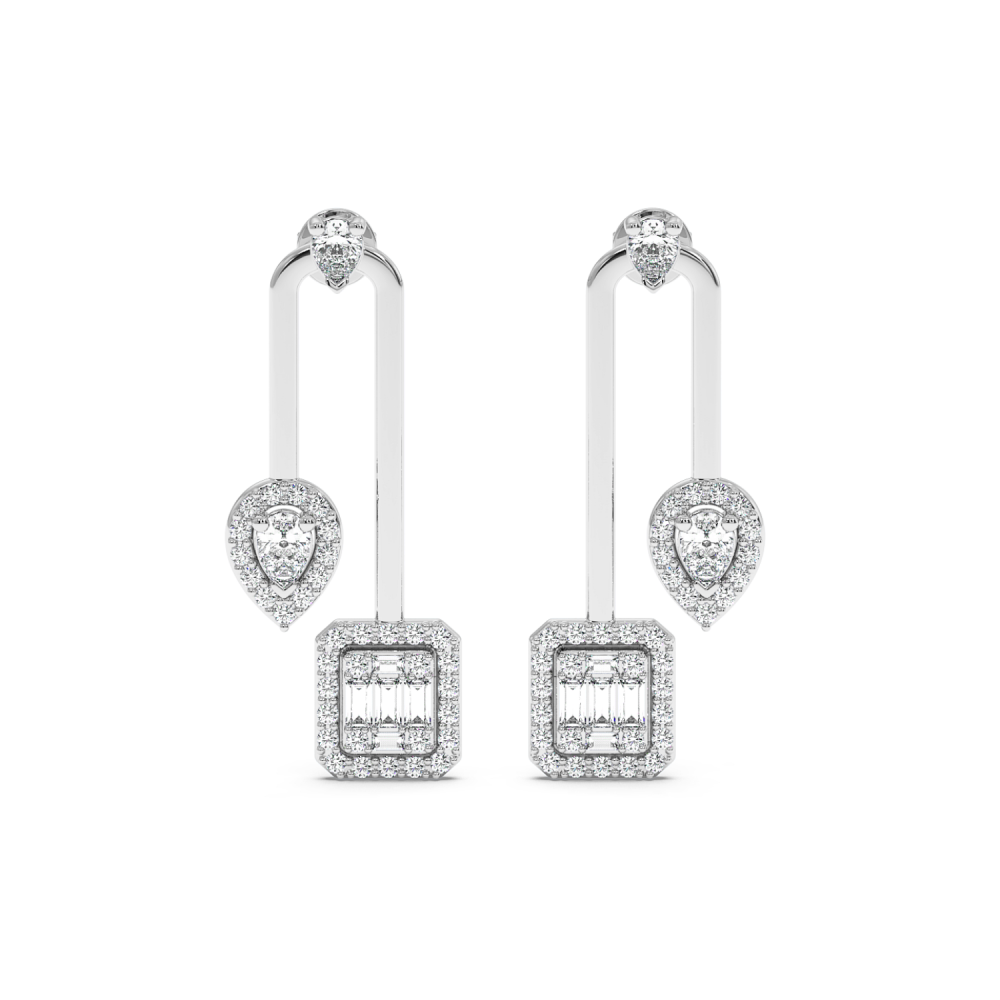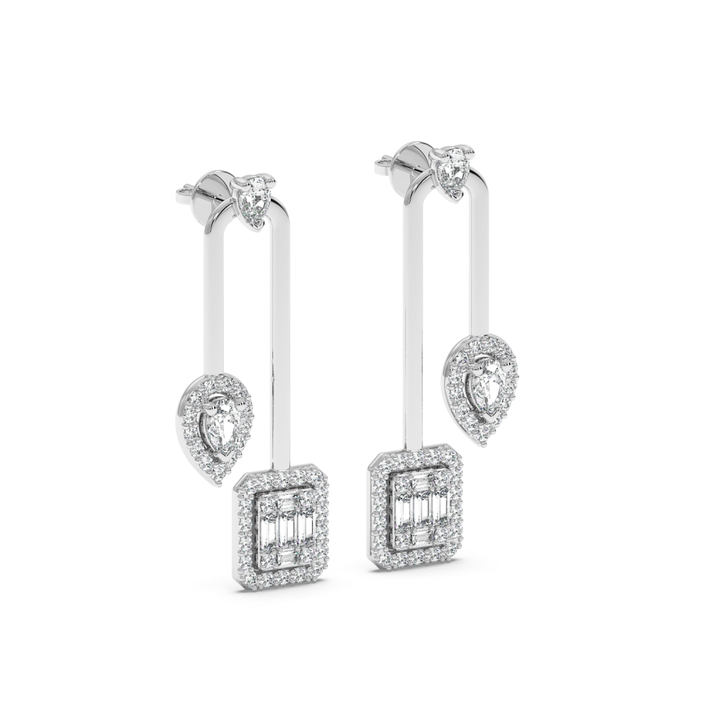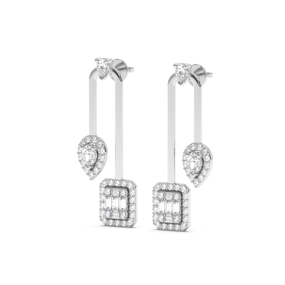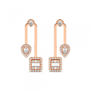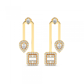 14 K gold earrings with 0.30ct pear diamonds, 0.23ct baget diamonds and 0.80ct round diamonds. The earrings weigh approximately 6 grams. Go to "SPECIFICATIONS" for more details about this product.